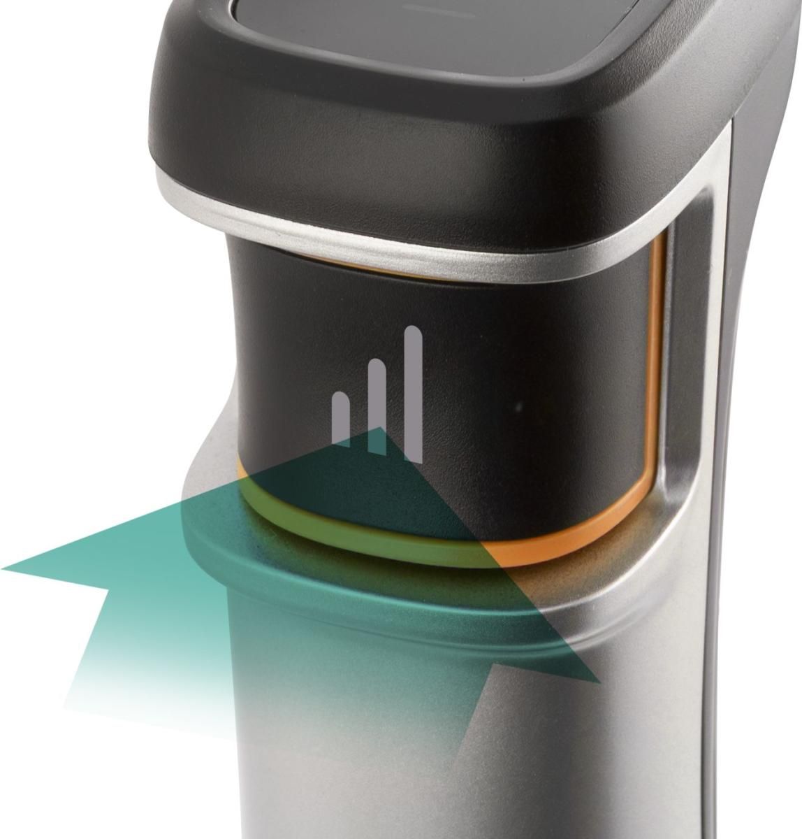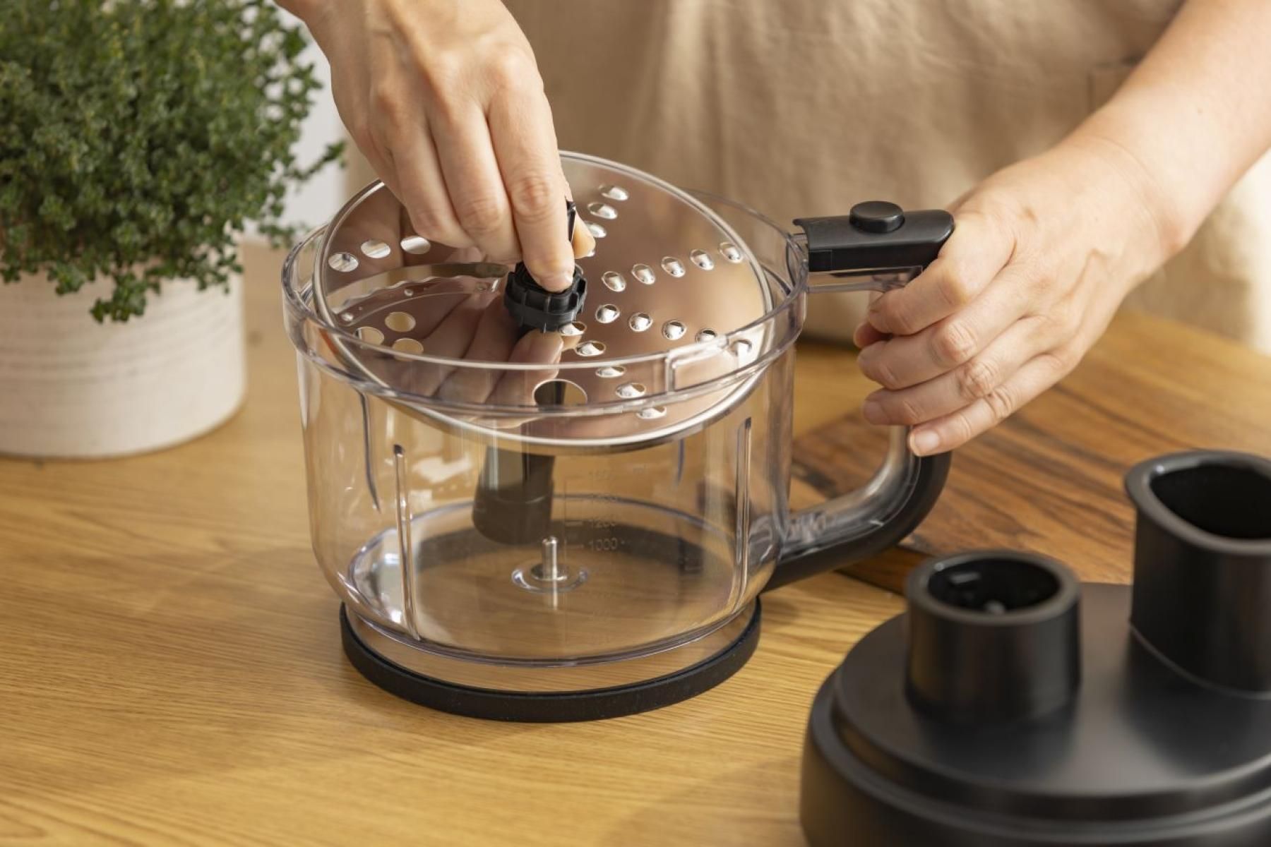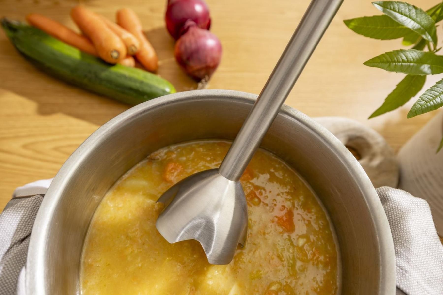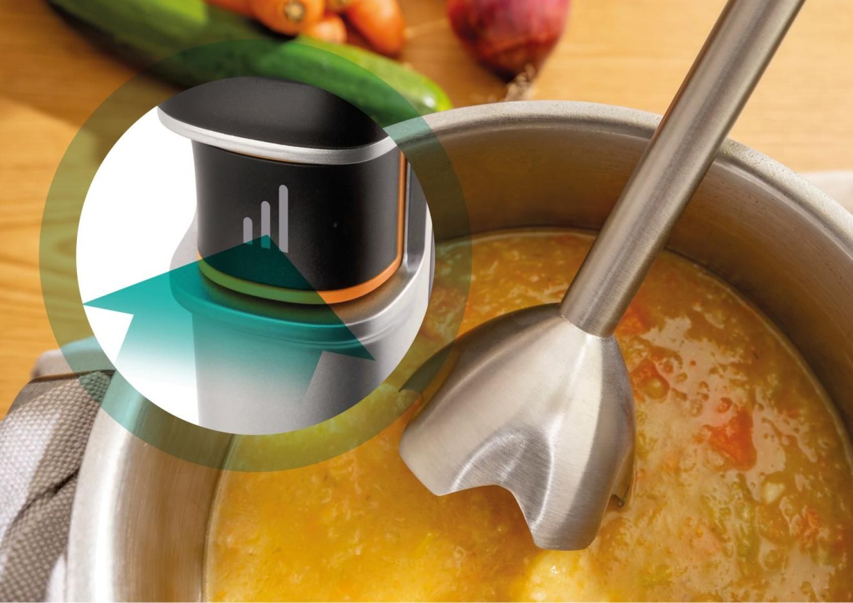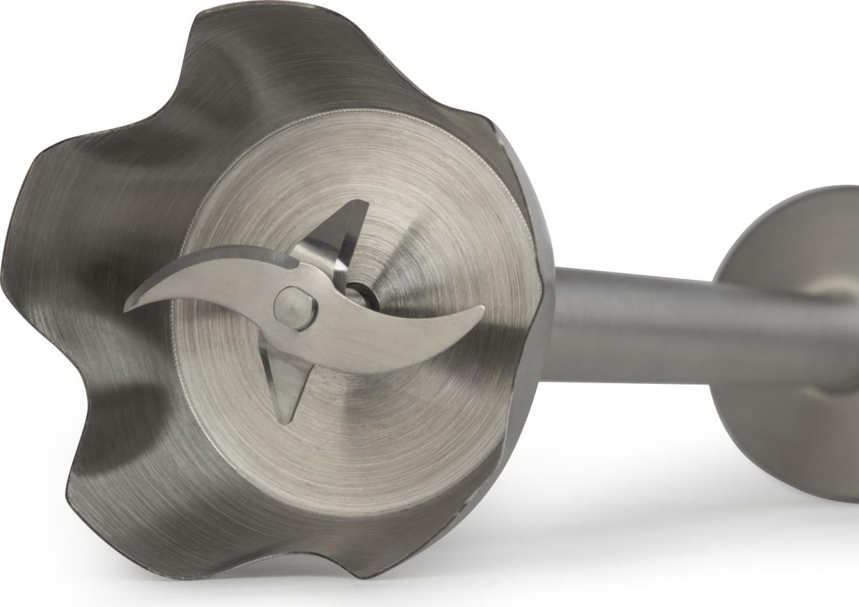 Додатково:4-лопасне лезо подрібнювача, мірна шкала на ємності, ніж з нержавіючої сталі, увімкнення натисканням кнопки, насадки приєднуються обертальним способом, DC-двигун постійного струму