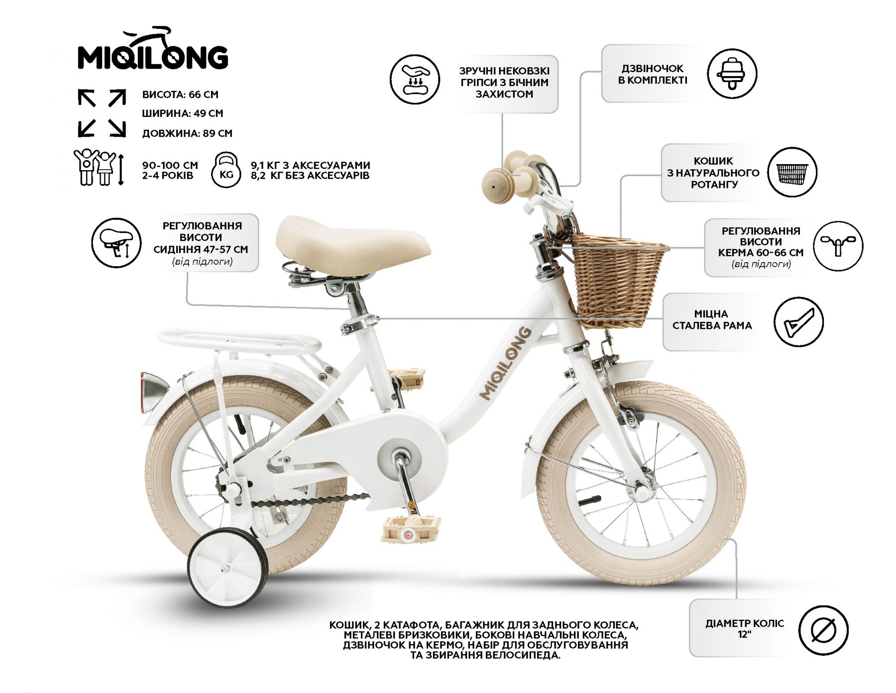 Комплектація:2 катафоти, кошик, дзвіночок на кермо, набір для обслуговування та збирання велосипеда, задній багажник, металеві бризковики, бокові навчальні колеса
