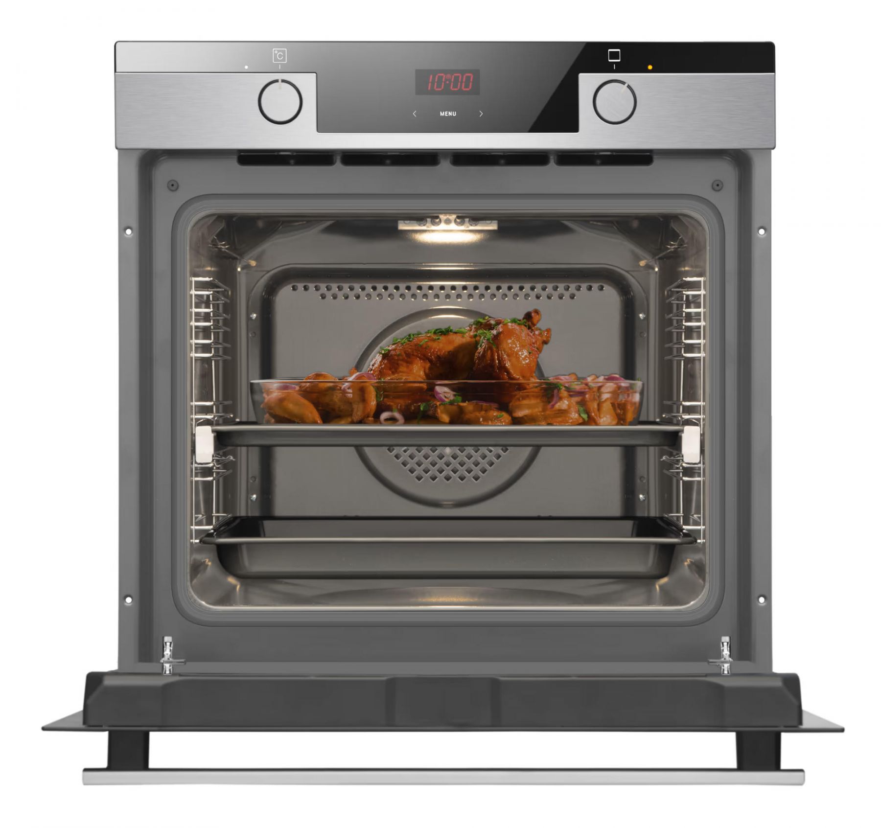 Електрична духова шафа Hansa BOEIS694097 з об’ємом 77 л і класом енергоефективності А пропонує 11 режимів приготування, включаючи турбоконвекцію, гриль, режим піци та функцію SoftSteam. Оснащена сенсорним програматором, LED-дисплеєм, плавним закриттям дверцят та системою легкого очищення.