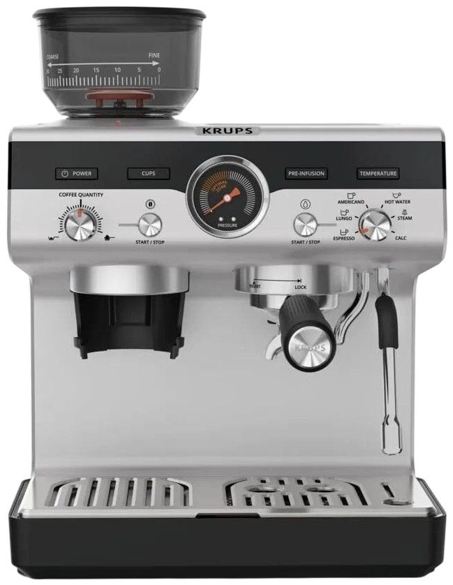 Кавоварка Krups ріжкова Precision+, 3.5л, вдубована кавомолка, ручний капучинатор, 15 бар, чорний-сірий
