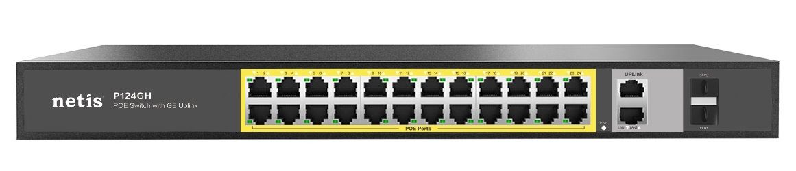 Комутатор Netis P124GH 24xFE PoE, 4xGE (2xUplink, 2xSFP), 360Вт, Некерований