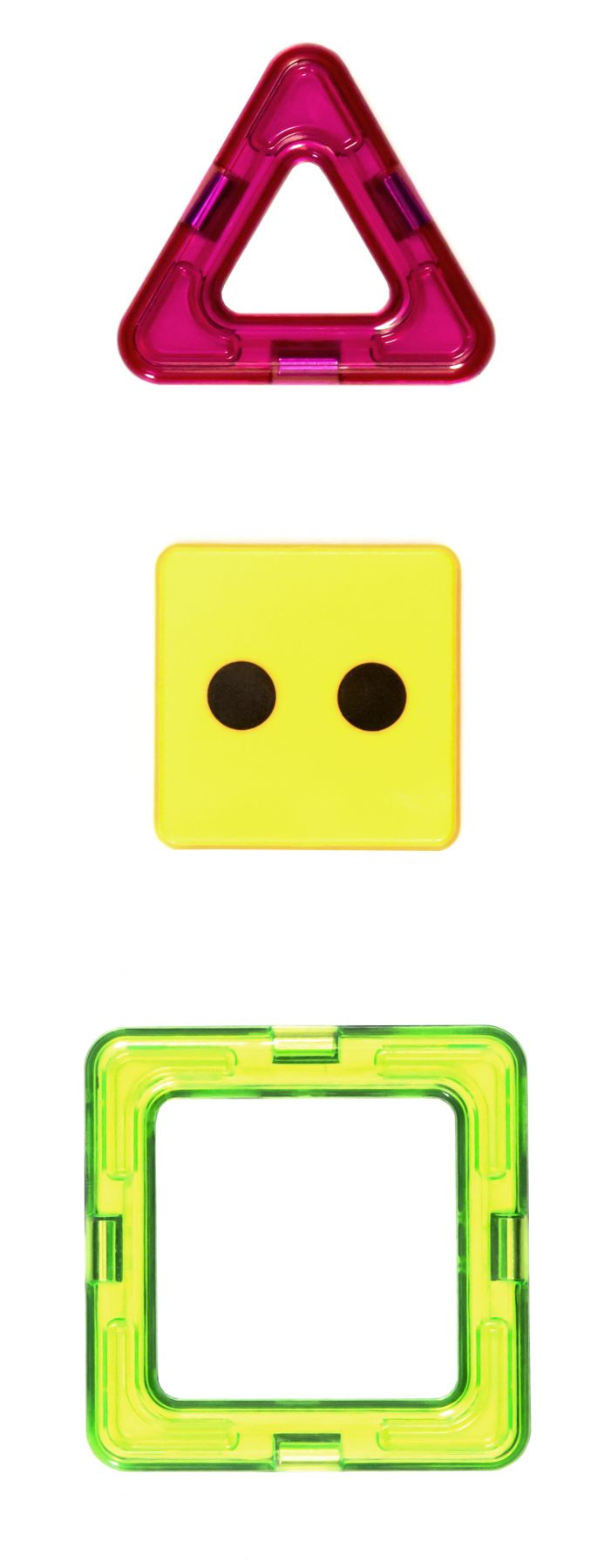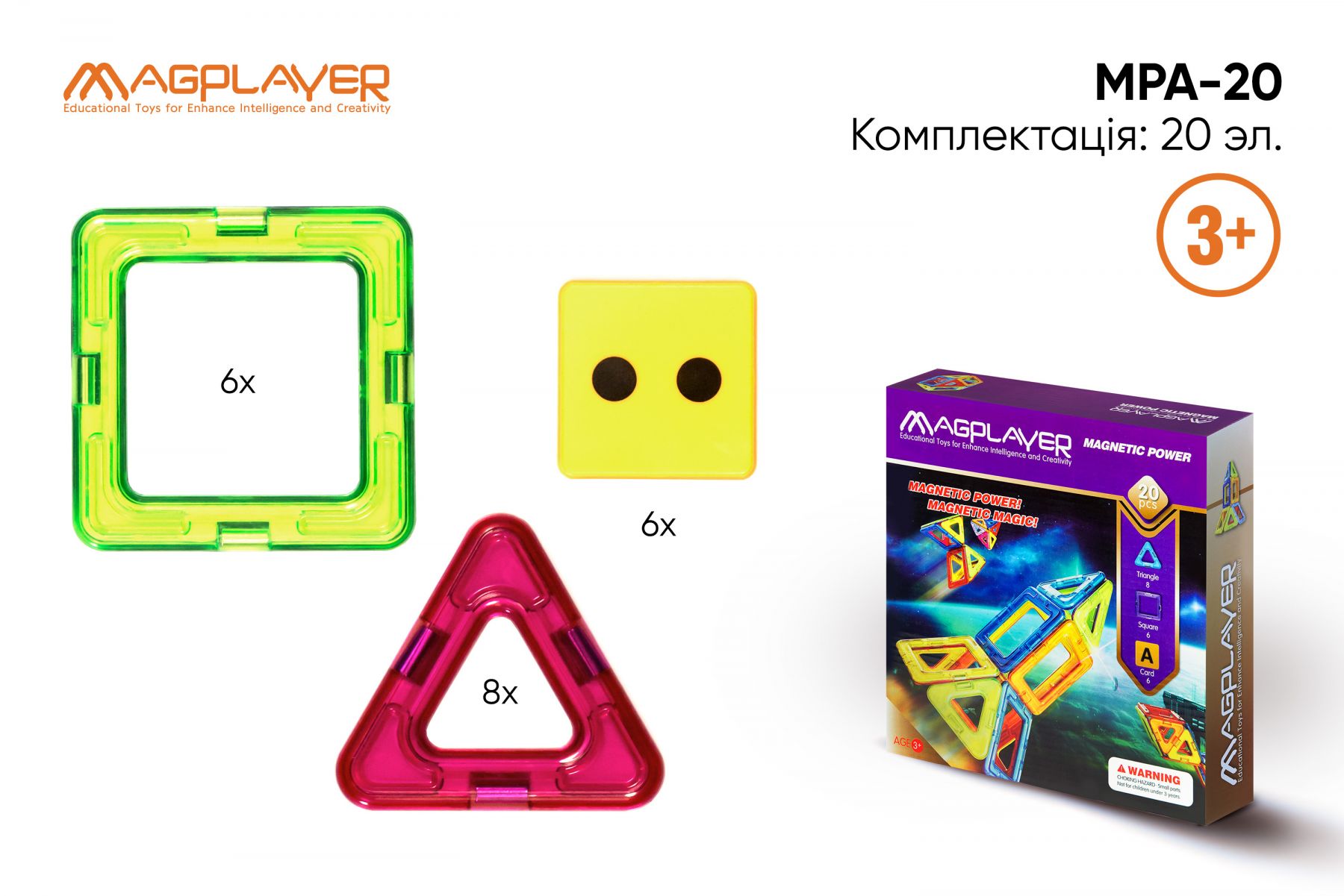 Конструктор MagPlayer з 20 деталями у формі квадрата та трикутника познайомить дитину з основами конструювання геометричних фігур. Також в набір входять картки з літерами, які дитина зможе швидко запам’ятати та вивчити. В основі конструктора MagPlayer використано магніт, який не потребує дотримання полярності для з’єднання. Тому навіть найменші діти зможуть легко конструювати фігури. Магнітний конструктор всесторонньо розвиває інтелект та моторику рук. Набір комплектується великою схемою для створення найрізноманітніших фігур.