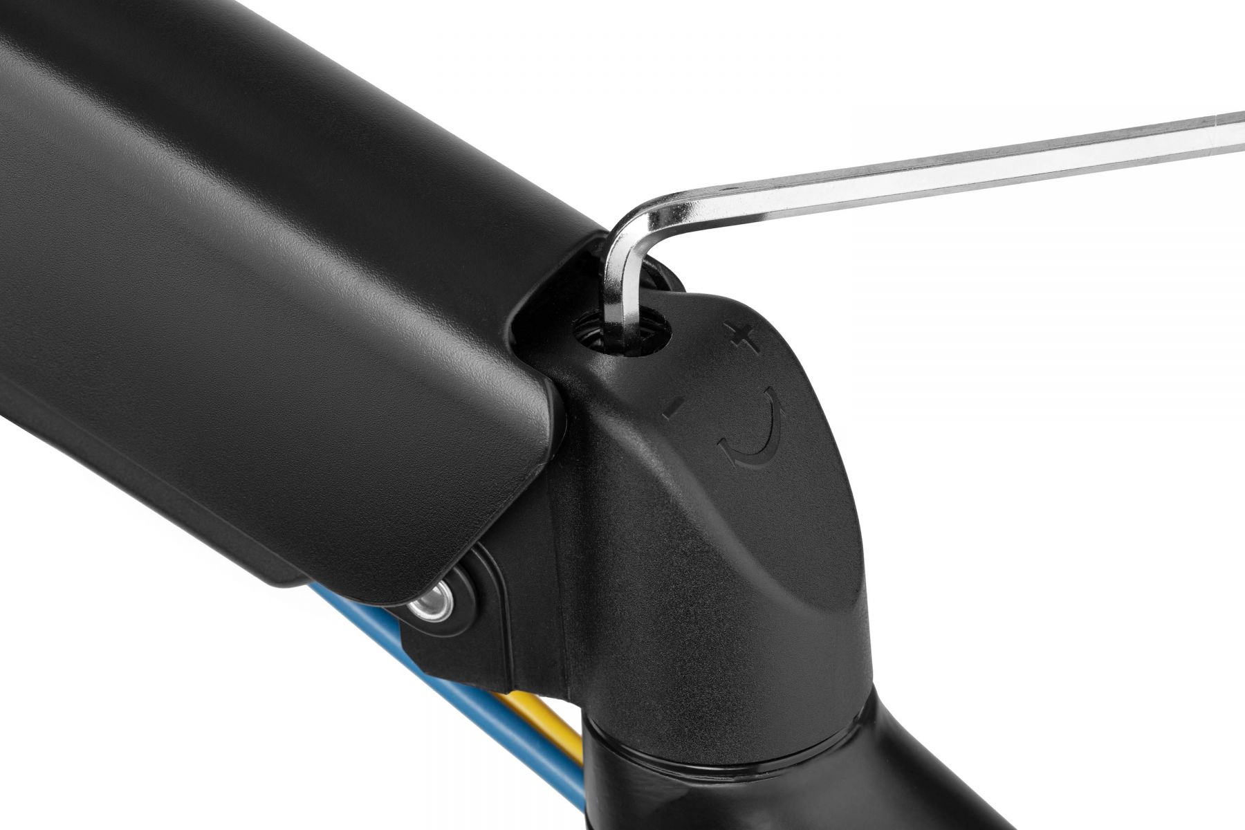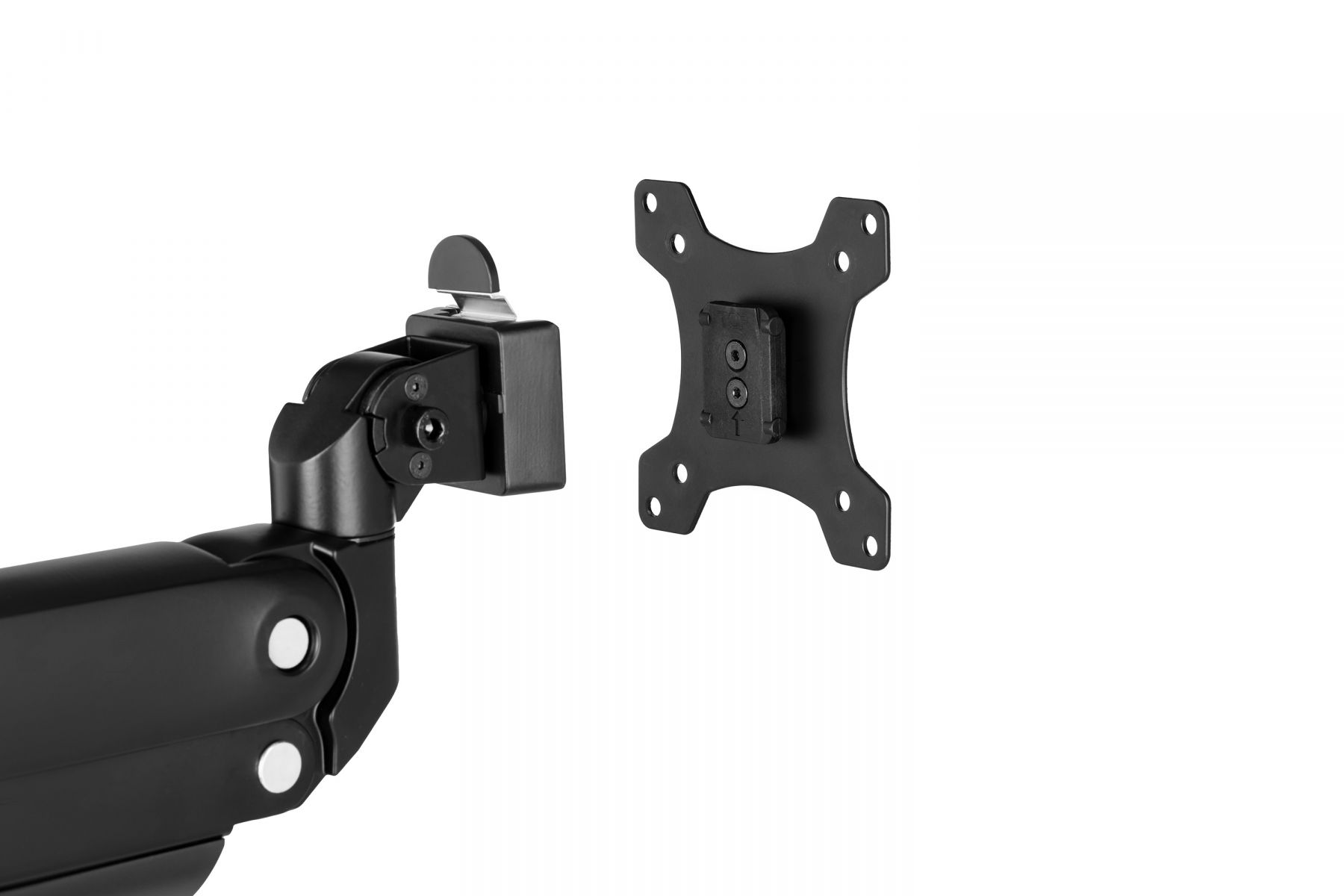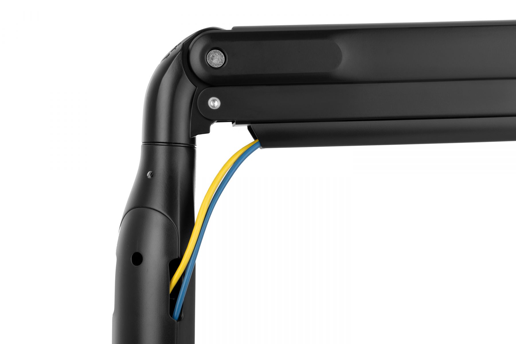 Підставка для монітора з вбудованим USB-хабом на два порти стандарту 3.0. Кронштейн має надзвичайно зручне й оптимальне кріплення та не займає багато простору на робочій поверхні. За допомогою системи прокладання кабелю всі дроти можна зібрати разом. Підставка підходить для моніторів із діагоналлю від 17″ до 43″ і витримує навантаження до 18 кг. Завдяки спеціальному пружинному механізму з регулюванням, можна самостійно налаштовувати оптимальну позицію – нахил/поворот/обертання.
