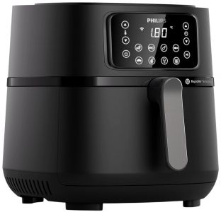 Philips XXL Connected серії 5000 – розумна мультипіч із 16 режимами приготування, керована через додаток HomeID та голосові команди. Технологія Rapid Air забезпечує хрустку скоринку без зайвого жиру, зменшуючи його вміст до 90%. Місткість 7,2 л дозволяє готувати до 6 порцій одночасно. Працює на 40% швидше та споживає на 60% менше енергії, ніж традиційні духовки. Усі знімні частини можна мити в посудомийній машині, а антипригарне покриття кошика QuickClean забезпечує легке очищення.
