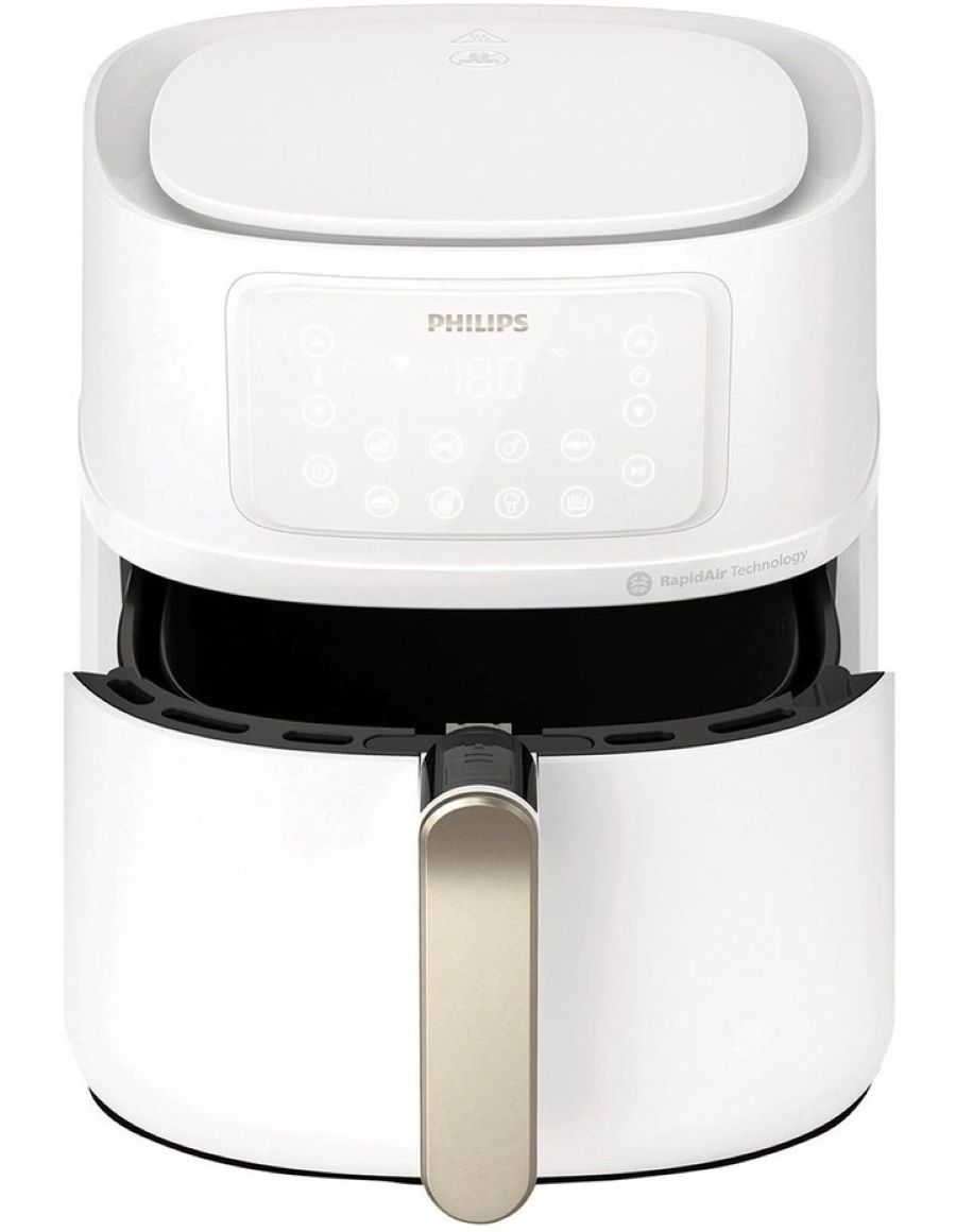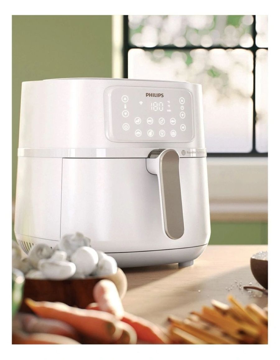 Особливості:Антипригарне покриття чаші, Підтримання тепла, Знімна кришка, Встановлення часу приготування, Регулятор часу, технологія Rapid Air, Застосунок HomeID з рецептами, Звуковий сигнал після завершення роботи, Внутрішнє покриття без вмісту бісфенолу A, Автоменю, Ємність XXL, З’єднання Wi-Fi, Автовимкнення після завершення процесу приготування, Кошик можна мити в посудомийній машині, Кошик QuickClean