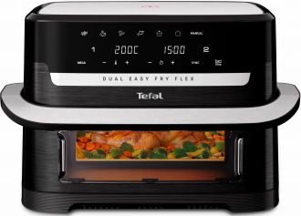 Мультипіч Tefal Dual Easy Fry Flex поєднує універсальність двох незалежних зон та місткість однієї великої чаші GiantZone об’ємом 9 л. Завдяки знімному роздільнику FlexCook можна готувати дві різні страви з окремими налаштуваннями або об’єднати простір для великої порції на всю родину. Технологія Extra Crisp забезпечує циркуляцію гарячого повітря для хрусткого результату з мінімальною кількістю олії, а функція SYNC допомагає синхронізувати завершення приготування двох програм.