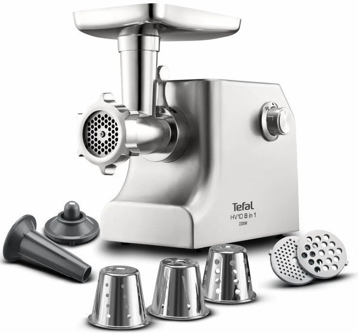 М'ясорубка Tefal HV10 8 IN 1 NE858D38. З м'ясорубкою HV10 приготування свіжого фаршу відбувається швидко та легко. Її потужний двигун 2200 Вт забезпечує вражаючу продуктивність до 5,5 кг на хвилину, а набір аксесуарів забезпечує абсолютну універсальність та широкий спектр застосування - 8 кухонних інструментів в одному приладі. Від домашніх фрикадельок до смачних сосисок, смачного шашлику та соковитих котлет для гамбургерів – м'ясорубка HV10 допоможе вам.