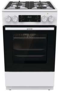 Комбінована плита Gorenje (50×60 см, біла) поєднує у собі газову варильну поверхню з чавунними решітками та багатофункціональну електричну духовку об'ємом 70 л. Оснащена електронним програматором IconLed, системою очищення парою AquaClean, телескопічними напрямними та плавним закриттям дверцят SoftClose.