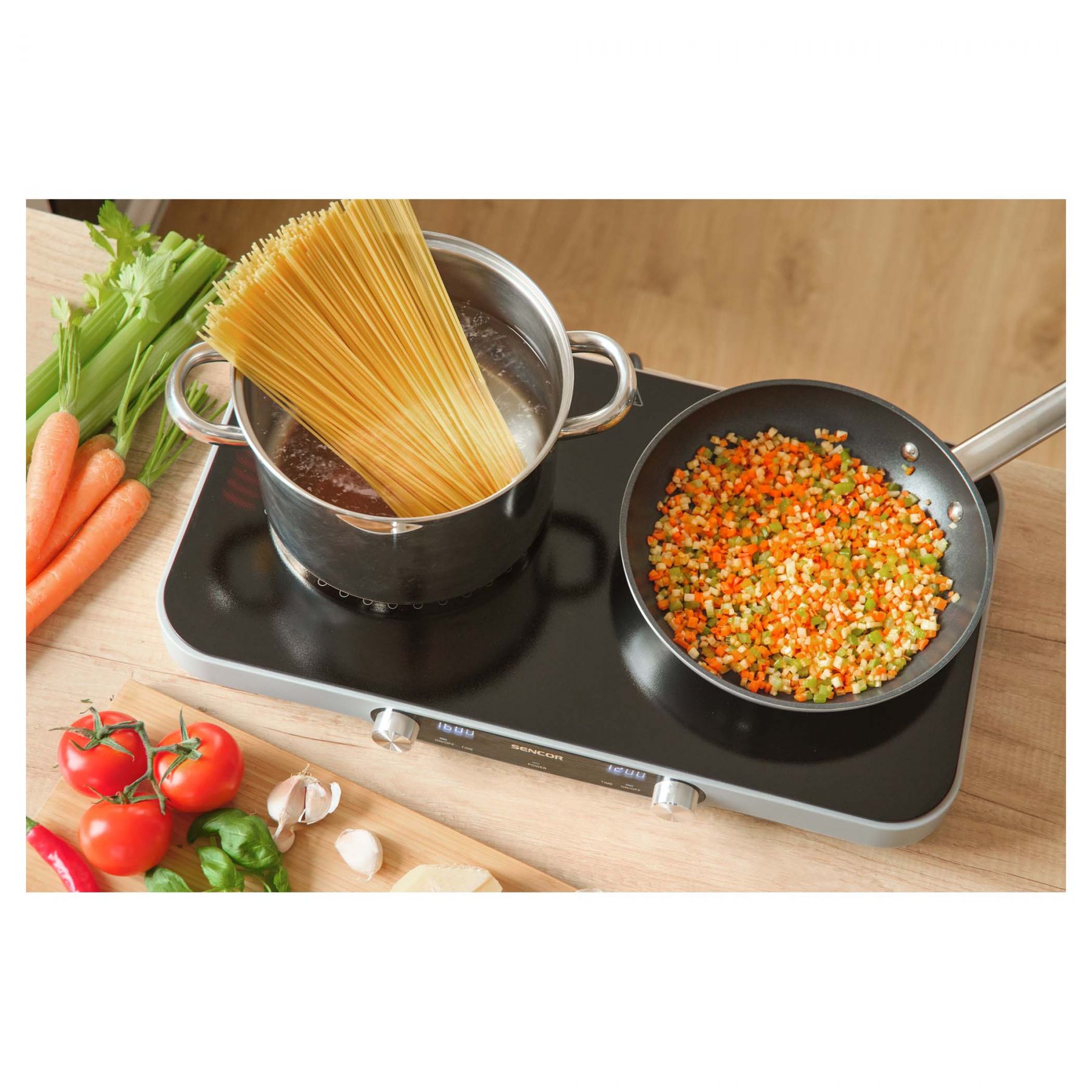 Sencor SCP2803BK — це практична двоконфоркова індукційна плитка, яка забезпечує швидке, ефективне та безпечне приготування страв у будь-яких умовах. Завдяки потужним індукційним зонам 2.2 кВт і 1.3 кВт, ви можете одночасно готувати дві страви з мінімальними енерговитратами. Sencor SCP2803BK — це потужна, надійна та мобільна альтернатива стаціонарній плиті, яка не потребує складного підключення.