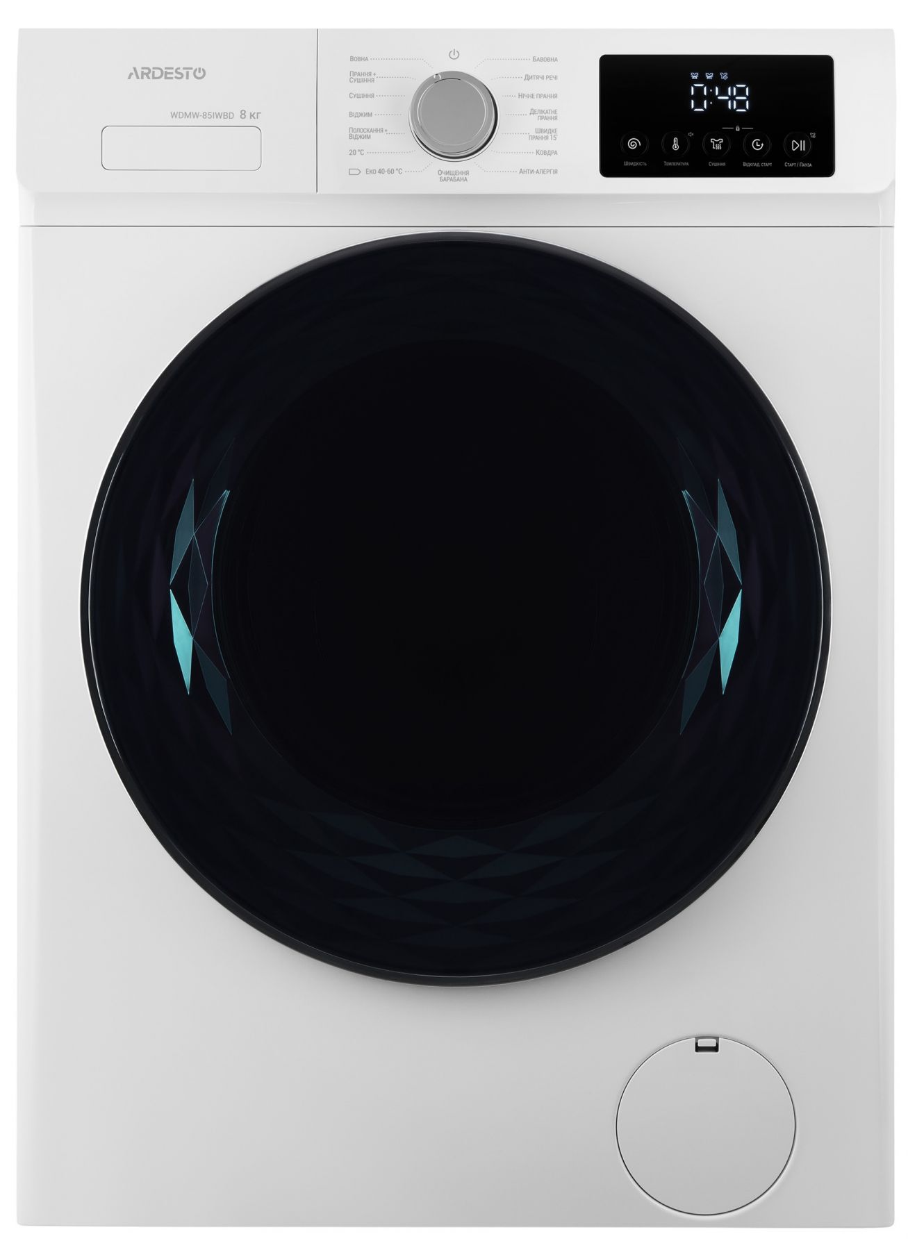 Фронтальна прально-сушильна машина ARDESTO справляється з пранням 8 кг і сушінням 5 кг білизни. Максимальна швидкість віджимання становить 1 200 об/хв, клас енергоефективності A+++. Інверторний двигун BLDC гарантує тиху, надійну й економну роботу. Модель підтримує 15 програм прання/сушіння, зокрема: «Еко 40–60 °C», «Бавовна», «20 °C», «Делікатне прання», «Інтенсивне прання», «Вовна», «Нічне прання», «Протиалергія», «Одяг дітей», «Ополіскування + віджимання», «Прання + сушіння 60'», «Швидке прання 15'». Передбачено цифровий дисплей, відкладений старт, можливість додавання білизни під час циклу та функцію очищення барабана водою, нагрітою майже до кипіння.