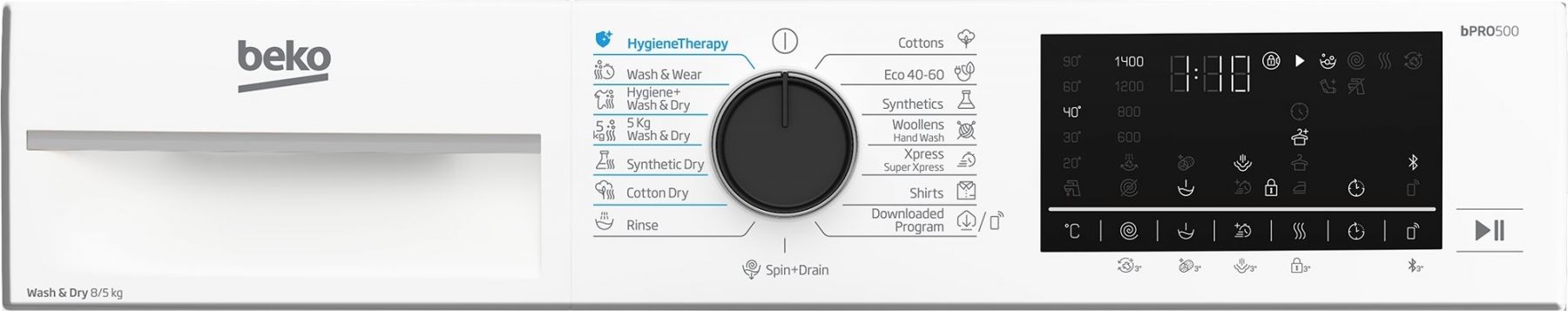 Програми:Синтетика, ополіскування, Злив + Віджим, Завантажувана програма, Експрес Щоденна/Експрес 14 хв, Вовна/Ручне прання, Сорочки, Бавовна ЕКО, замочування, Hygiene+Wash&Dry (Гігієнічна+ Випери та Висуши), Wash&Wear (Випери та Одягни), Hygine Air Refresh, 5 кг Випери та Висуши, Швидке прання +, Вовна сушка, Синтетика сушка