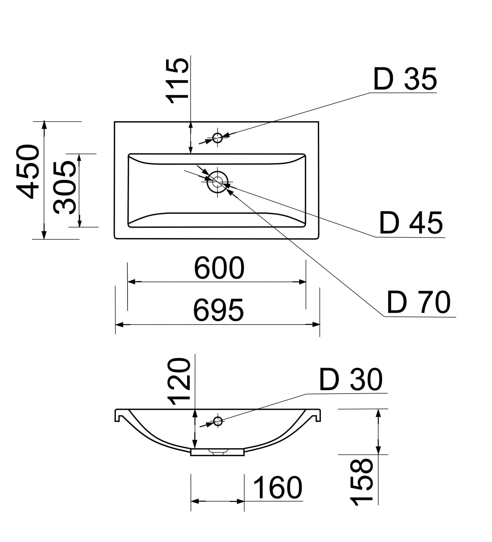 Раковина Adamant CERS має прямокутну форму, виготовлена зі штучного каменю з розмірами 695 x 450 x 158 мм та білим кольором. Накладний тип встановлення з отворами для змішувача та переливу дозволяє монтаж на тумбу. Матеріал створений за технологією Solid Surface, стійкий до впливу та довговічний.