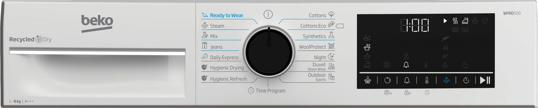 Програми:Спортивний одяг, Синтетика, Бавовна, Вовна, Мікс, джинси, експрес, пухові вироби, Еко бавовна, гігієнічно-освіжаючий цикл, гігієнічна сушка, освіжити з парою, Ready to Wear, нічний режим, час сушки