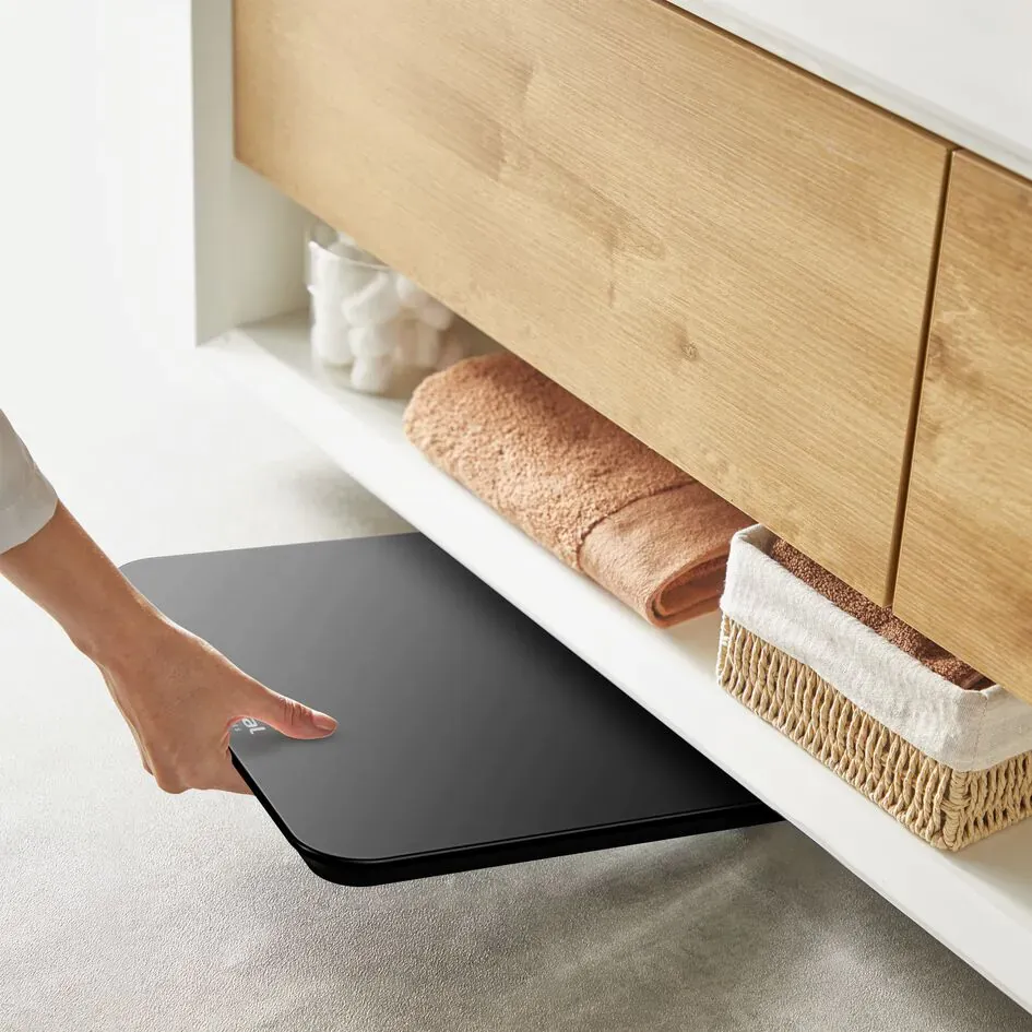 Електронні підлогові ваги Tefal Premiss з тонкою скляною платформою 30х30 см і чітким LCD-дисплеєм. Межа зважування 160 кг з кроком 100 г, автоувімкнення та автовимкнення, вибір одиниць кг/st/lb. Після використання ваги легко чистити та зручно зберігати.
