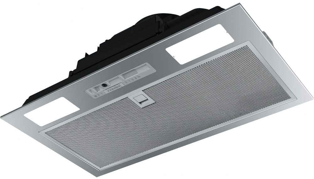 Витяжка Franke Inca Smart FBI 525 GR вбудовується в кухонну шафку шириною 52 см, залишаючись прихованою за фасадом. Три швидкості з механічним слайдером забезпечують продуктивність від 160 до 335 м³/год, достатню для невеликих кухонь до 13 м². Алюмінієві фільтри вловлюють жир, а два LED-світильники 4000 К створюють рівне освітлення варильної поверхні.