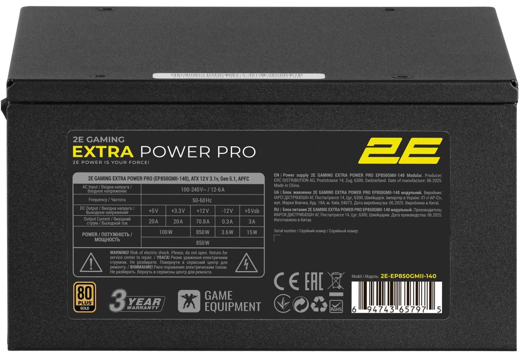 Блок живлення 2E GAMING Extra Power Pro ATX3.1 GEN5.0 (850W), >90%, 80+ Gold, 140мм, 1xMB 24pin(20+4), 2xCPU 8pin(4+4), 3xMolex, 6xSATA, 4xPCIe 8pin(6+2), 1xPCIe GEN5 16pin, Full Modular
