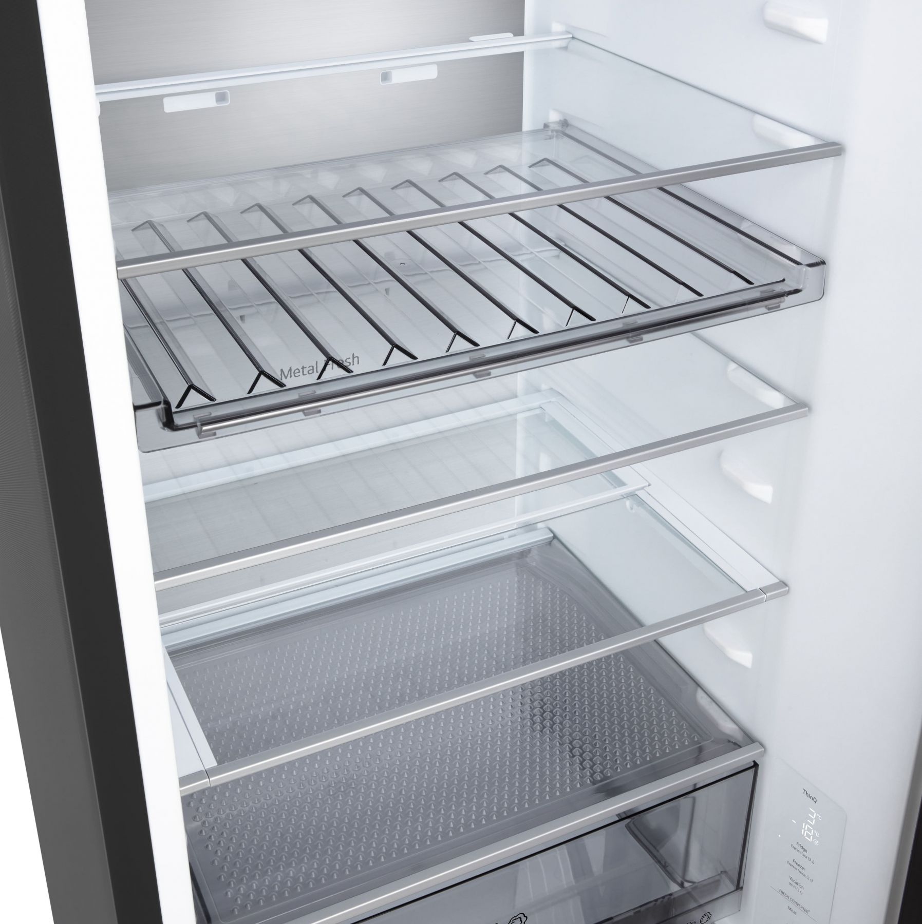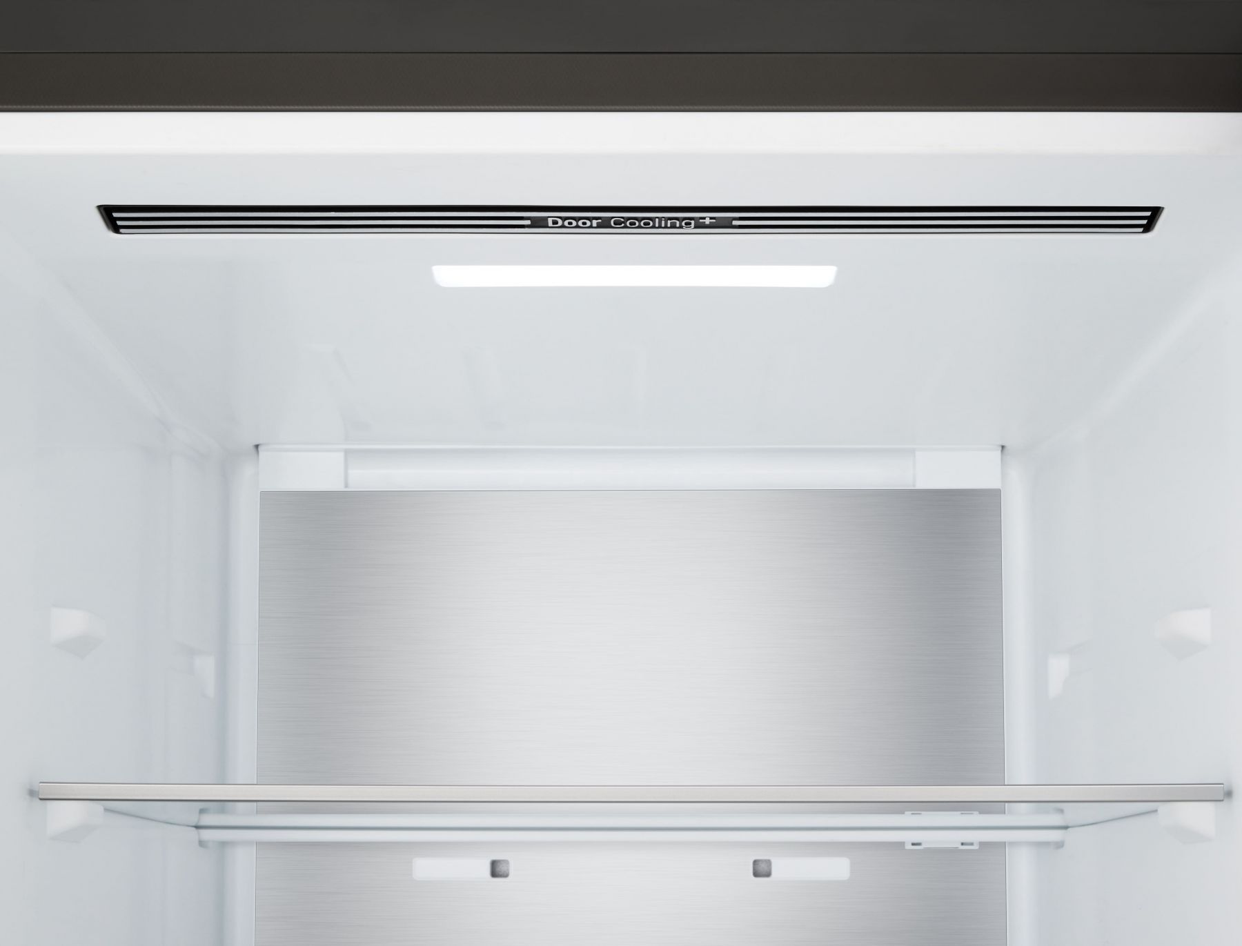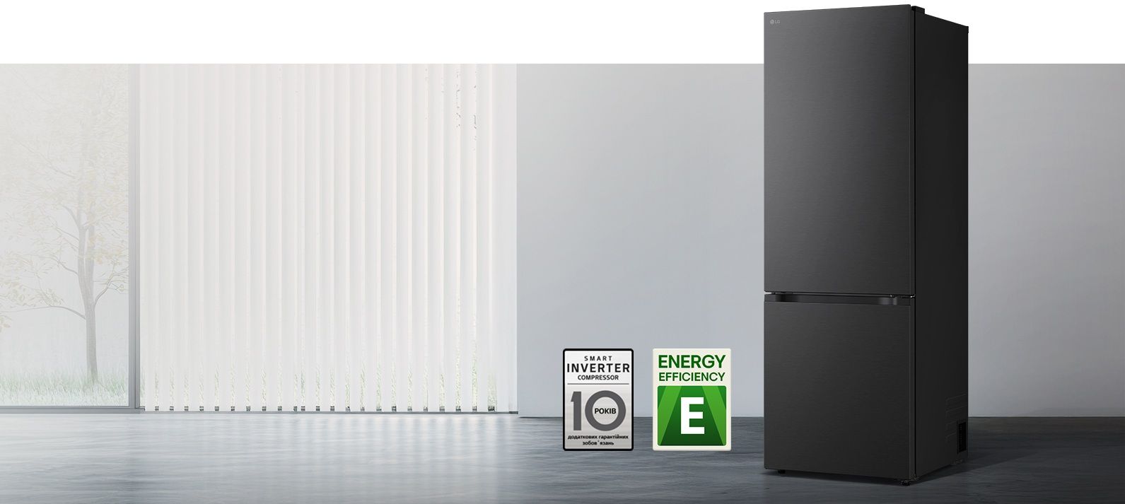 Холодильник LG GC-B509ETSM з нижньою морозильною камерою має корисний об’єм 375 л (262 л холодильне + 113 л морозильне відділення) і належить до енергетичного класу E. Інверторний компресор забезпечує рівень шуму 35 дБ та потужність заморожування 10 кг на добу. Система Total No Frost усуває необхідність розморожування, а Metal Fresh разом із зонами Fresh Converter та Fresh Balancer підтримують оптимальні умови для різних продуктів. Матове чорне покриття корпусу та прихована горизонтальна ручка створюють стриманий сучасний вигляд.