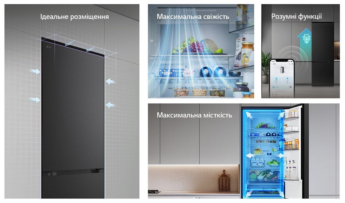 Функції / можливості:Експрес заморозка, Експрес охолодження, Багатопотокова система охолодження Multi Air Flow, Сигнал відкритих дверцят, Зона свіжості FRESH Balancer, Зона свіжості FRESH Converter, DoorCooling+, Технологія контролю напруги, LG ThinQ з керуванням через Wi-Fi, Інтелектуальна система діагностики Smart Diagnosis