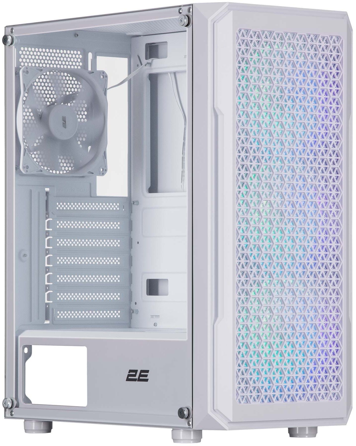 Корпус 2E 2E Gaming Hexagon G338W білий з трьома вбудованими 120мм ARGB вентиляторами на передній панелі плюс додатково один 120мм ARGB вентилятор на задній панелі. Модель відмінно підійде для самостійного та промислового складання завдяки раціонально організованому внутрішньому простору і не складній конструкції.