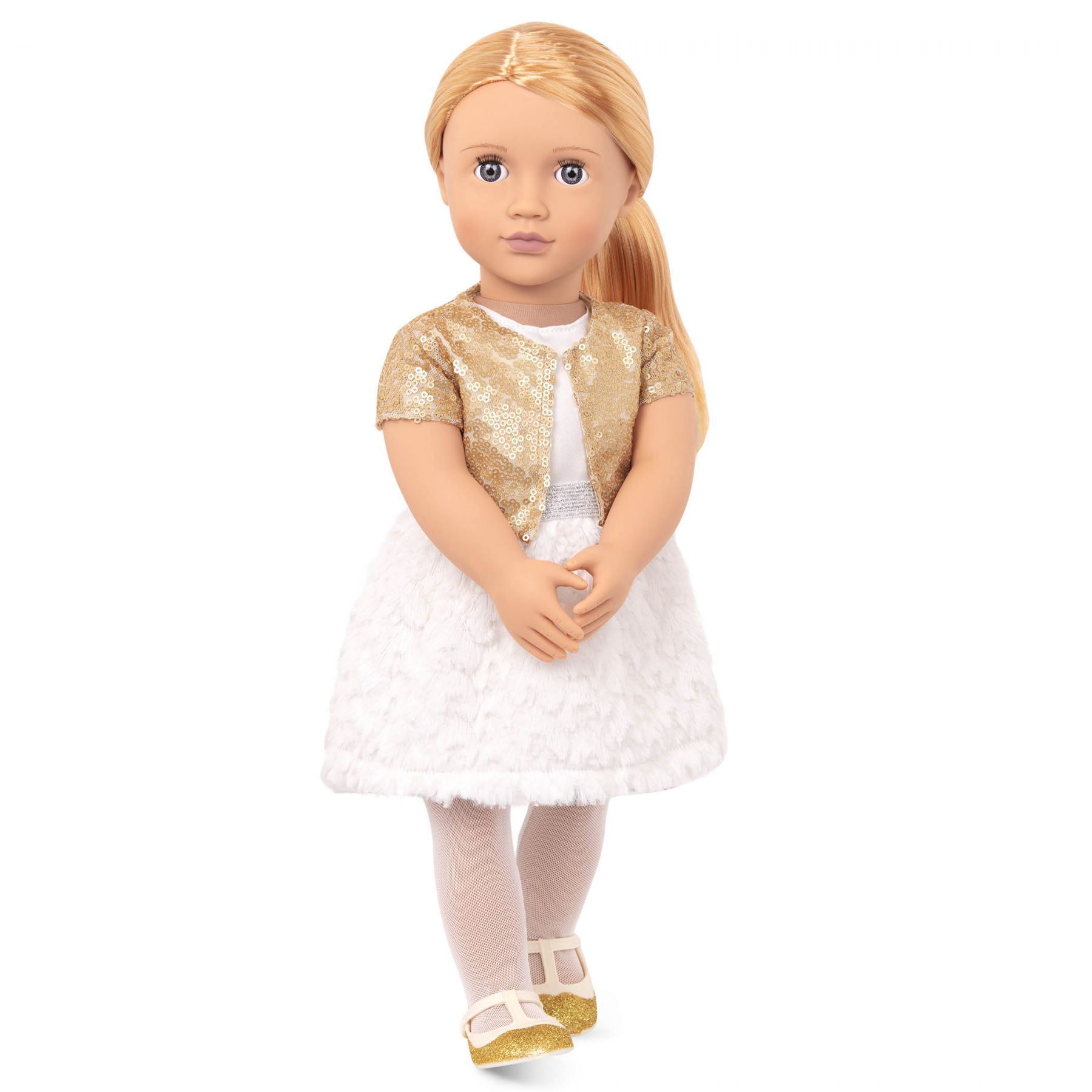 Хоуп обожнює елегантні образи та витончений стиль. Її світле довге волосся прикрашає ніжна прикраса з перлами. У наборі з лялькою: взуття, сукня, нижня білизна, колготи, прикраса для волосся та жакет. Від інших ляльок колекції Our Generation Хоуп відрізняє тонкий смак та вишукані манери, адже вона – справжня леді. Висота лялечки Хоуп 46 см. Увесь одяг виготовлений з якісного текстилю, та є абсолютно безпечним для малюка. Лялька чудово доповнить колекцію іграшок від Our Generation, а також відмінно поєднується з наборами аксесуарів бренда. Рекомендований вік: 3+