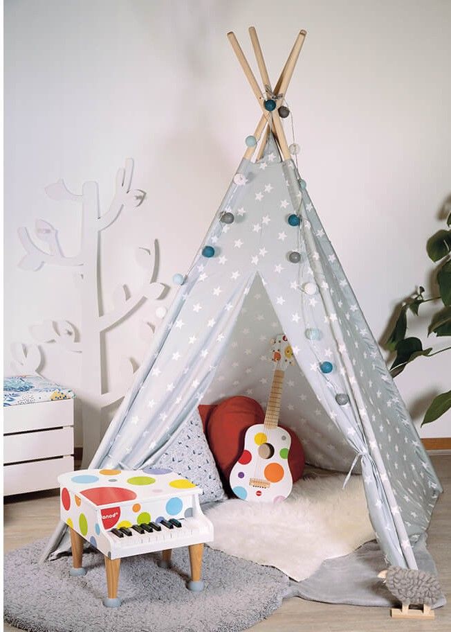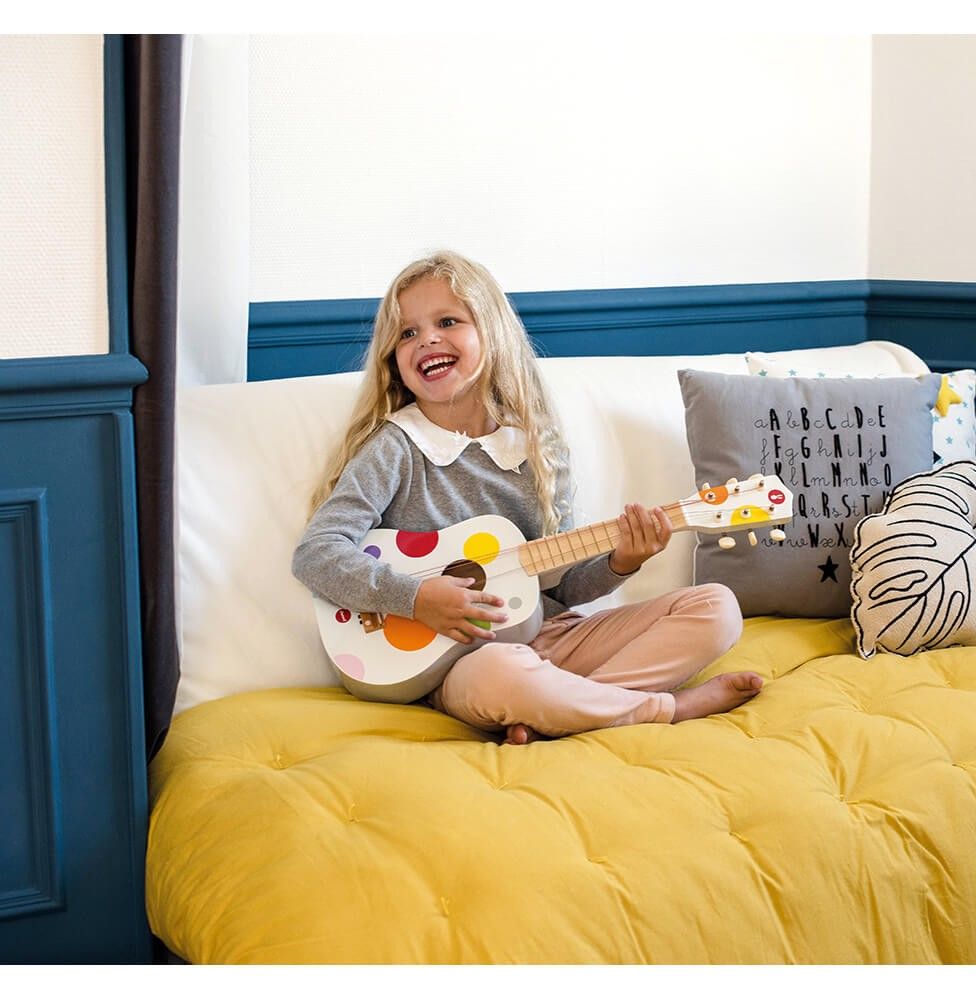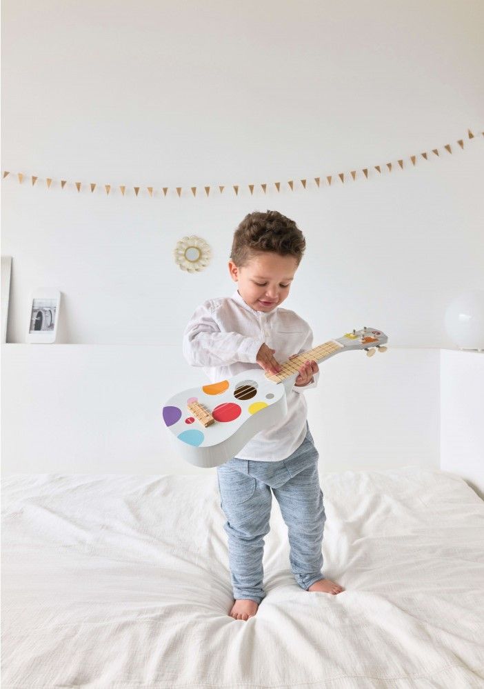 Гітара французького виробника іграшок Janod належить до серії «Конфеті». Дерев’яний інструмент має шість струн. Гітара біла, з кольоровим візерунком у стилі, що нагадує розсип кольорового конфеті. Конфетті прокидається всім почуттям і представляє наймолодших музикантів радість музичної імпровізації. Гітара розміром 64х22х6 см. Іграшка здобула визнання і отримала нагороду Оппенгейма у США. Для дітей від 3 років.