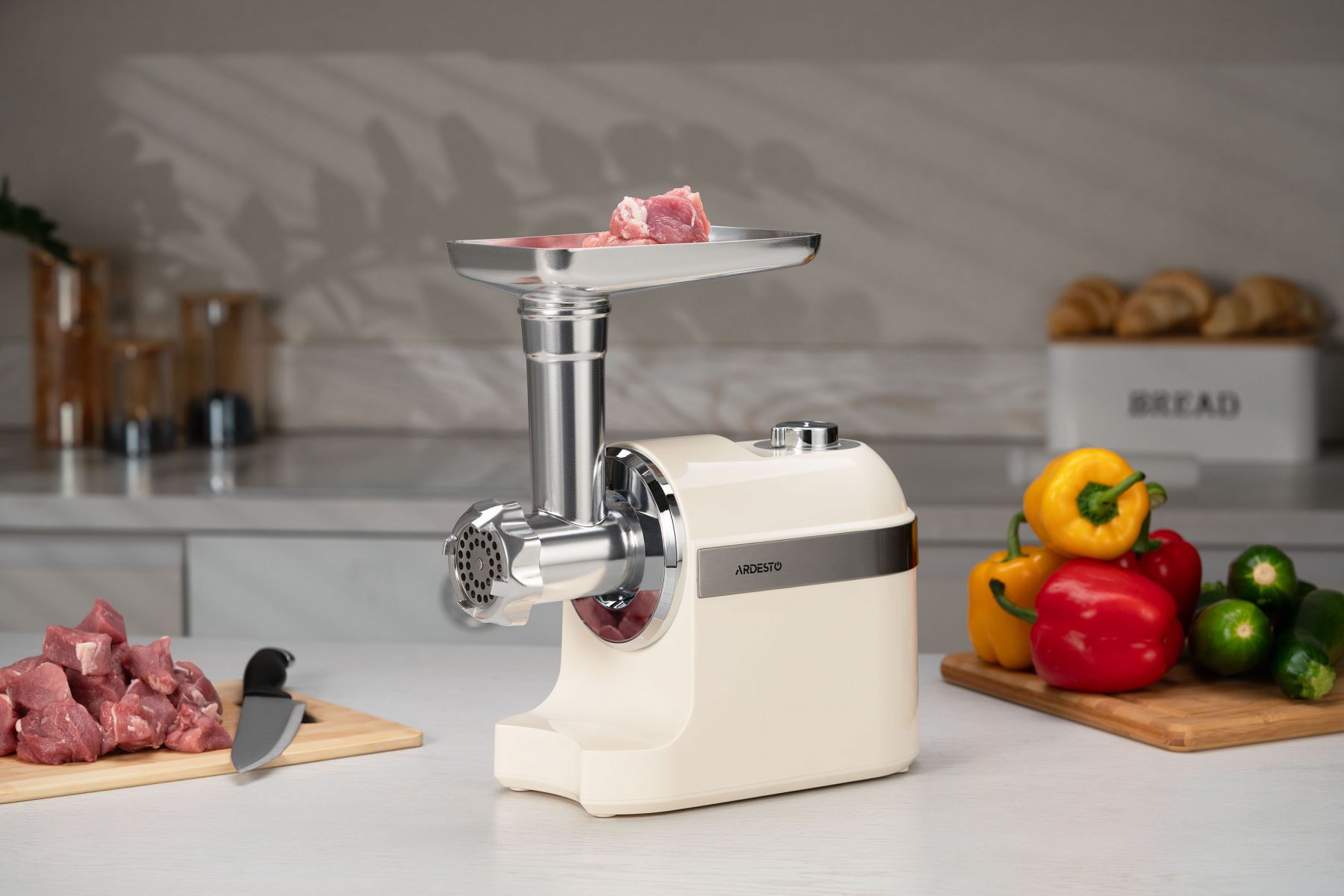 М'ясорубка ARDESTO, 1800Вт, 2кг/хв, 3 решітки, насадка для ковбас, кеббе, пластик, бежево-сріблястий