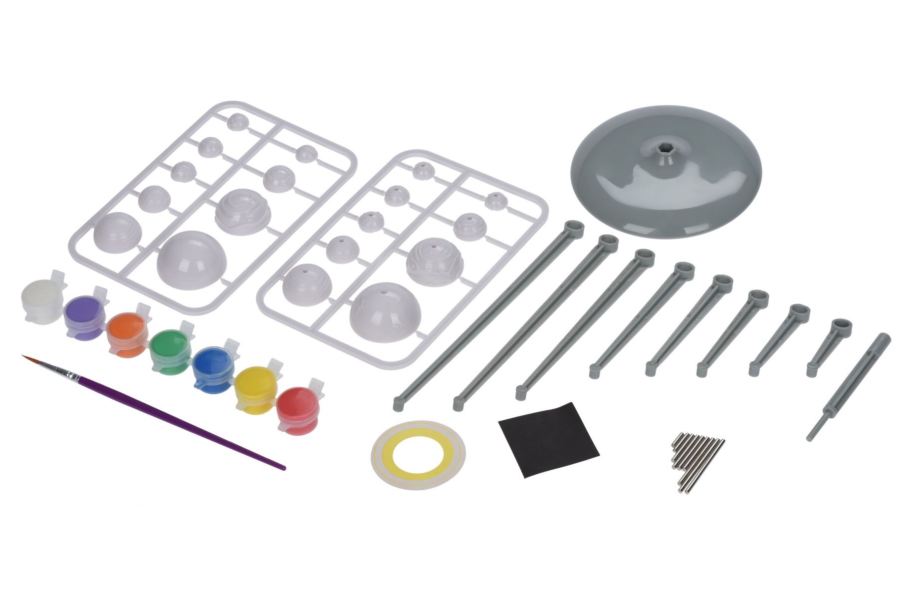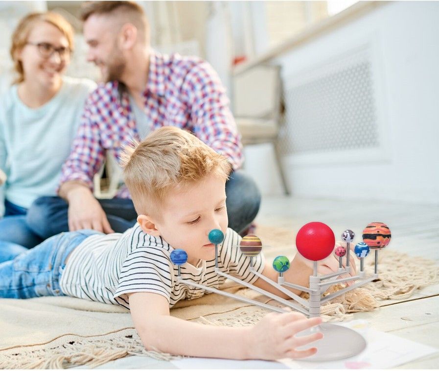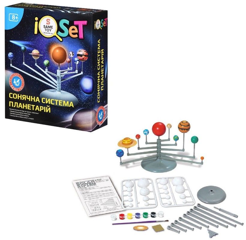 Науковий набір Same Toy «Сонячна система. Планетарій» призначений для створення тривимірної моделі Сонячної системи з вісьмома планетами та Сонцем. Під час складання формується наочне уявлення про будову космічного простору. Моделі планет і центральної зірки потребують ручного розфарбування, що робить процес більш захопливим. Збірка поєднує творчість і навчання. Набір доречний для домашніх занять і шкільних проєктів.