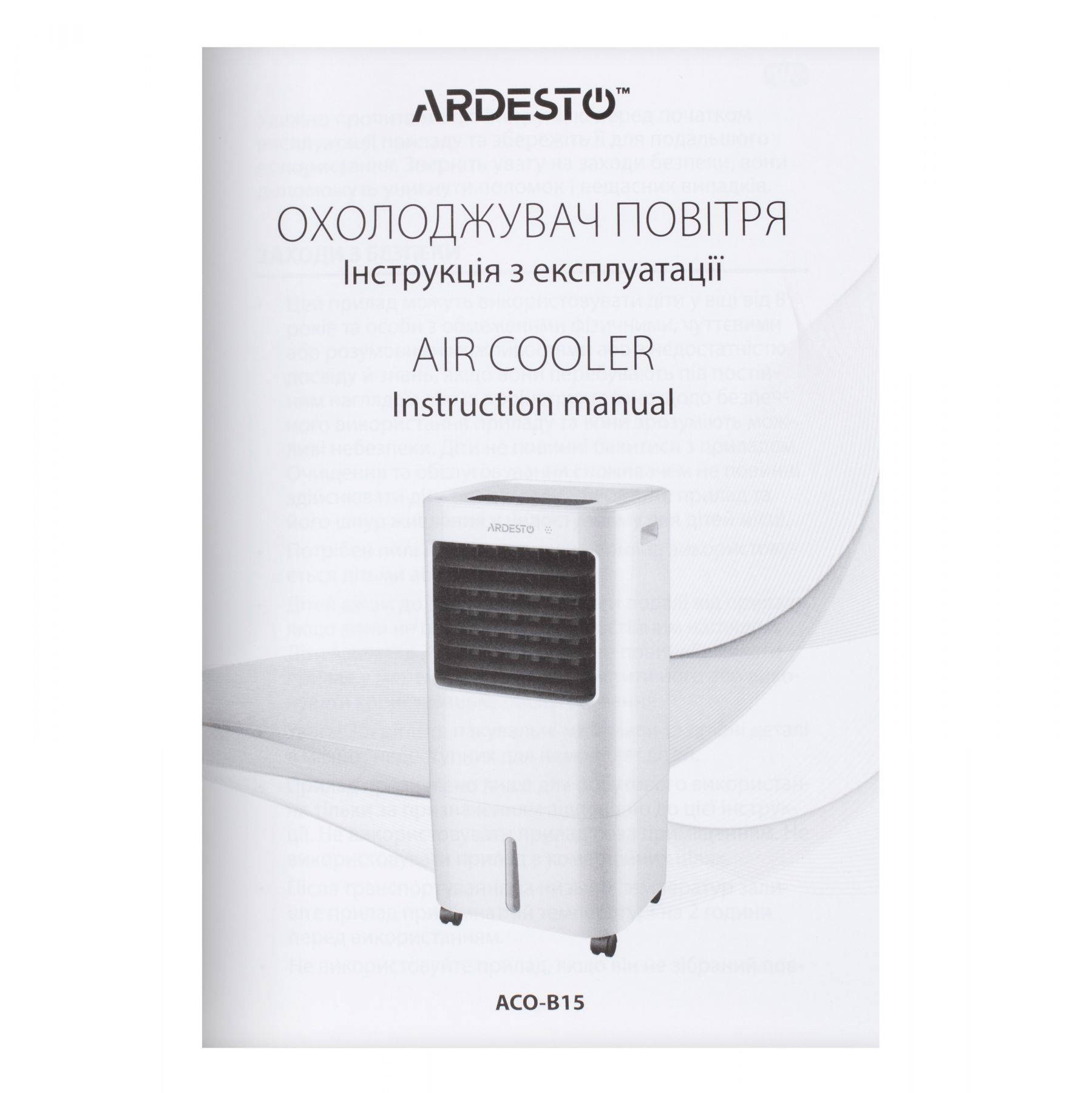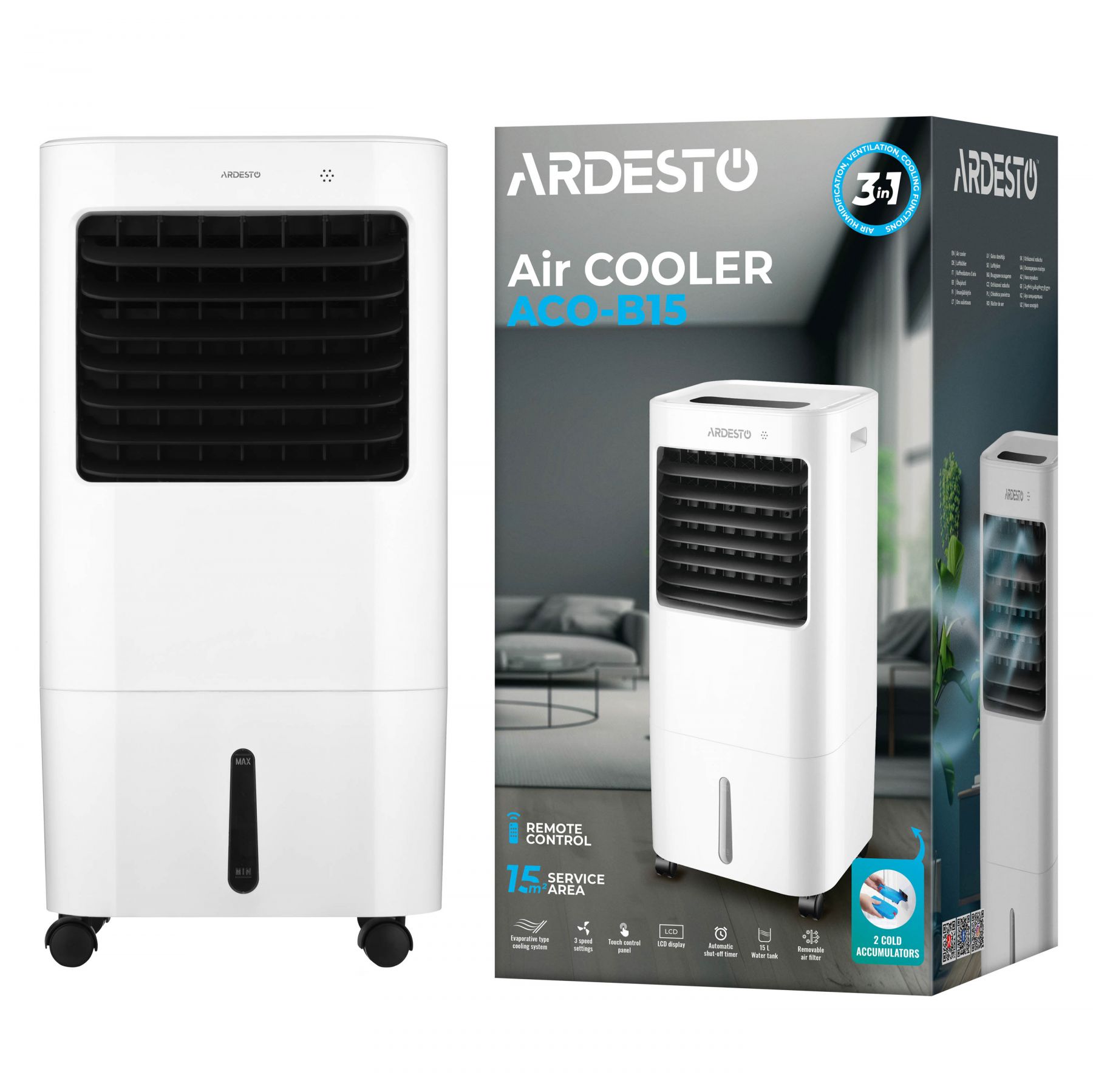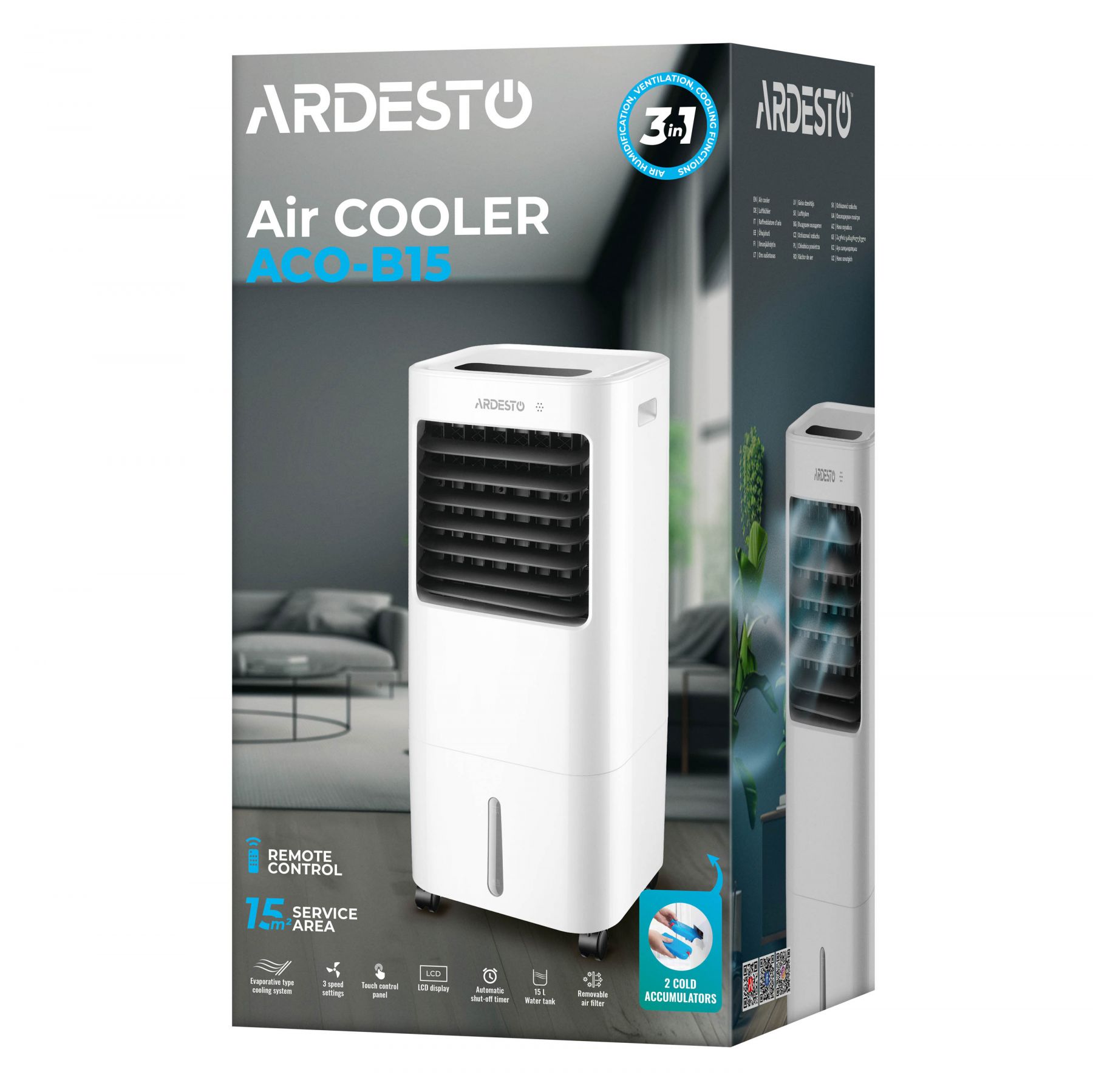 Охолоджувач повітря ARDESTO ACO-B15 3в1 охолоджувач-зволожувач-вентилятор, 15 м2, ел. кер-ня, резервуар 15 л., 410 м3/год, дисплей, таймер, авто вим-ня, пульт дк, біл/чорн