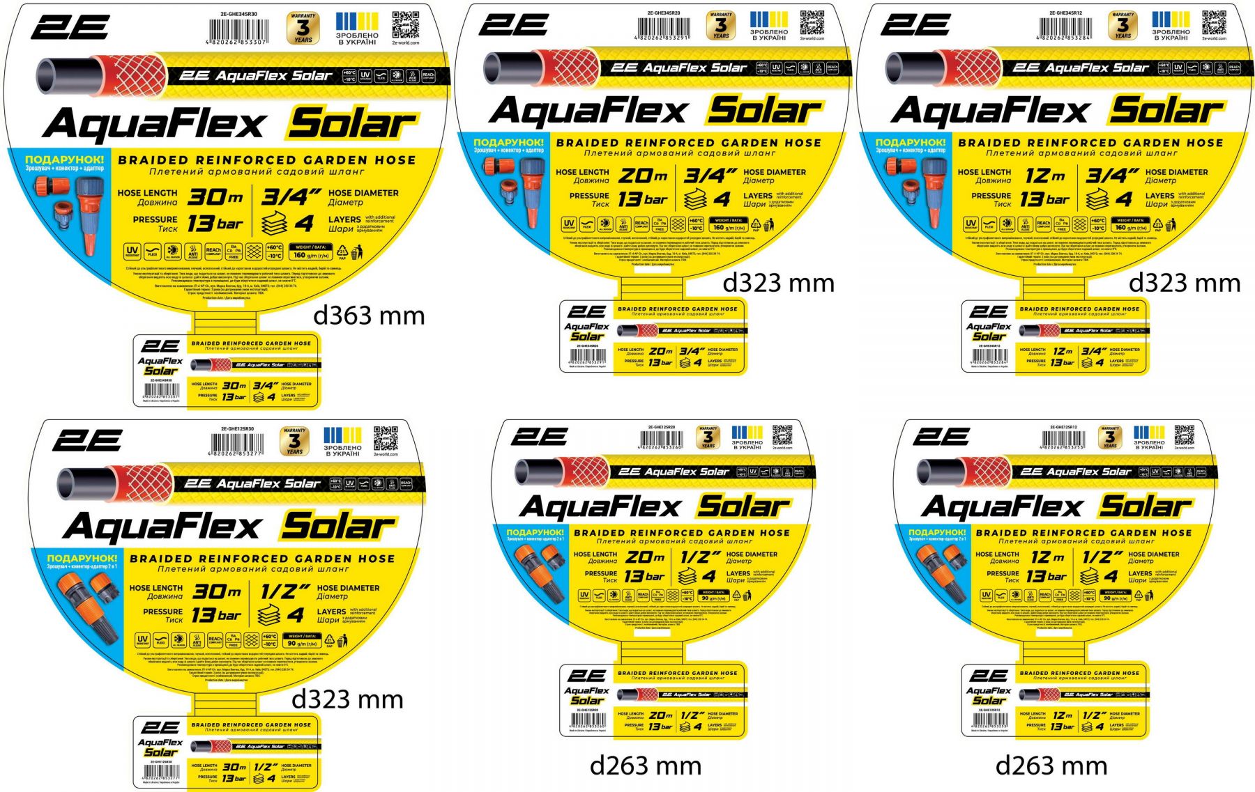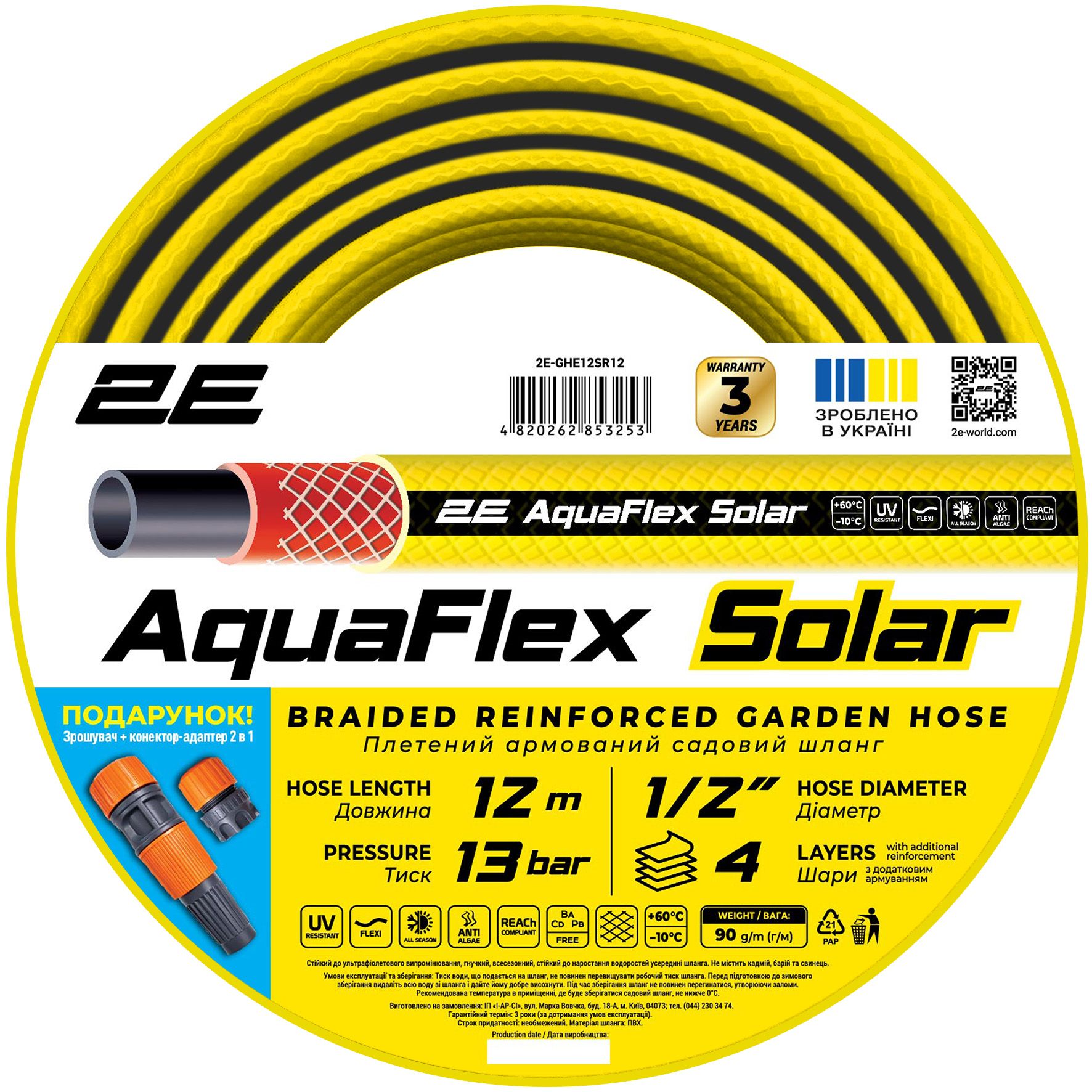 Шланг садовий 2Е AquaFlex Solar 1/2" 12м 4 шари 13бар -10+60°C зрошувач конектор адаптер 2в1