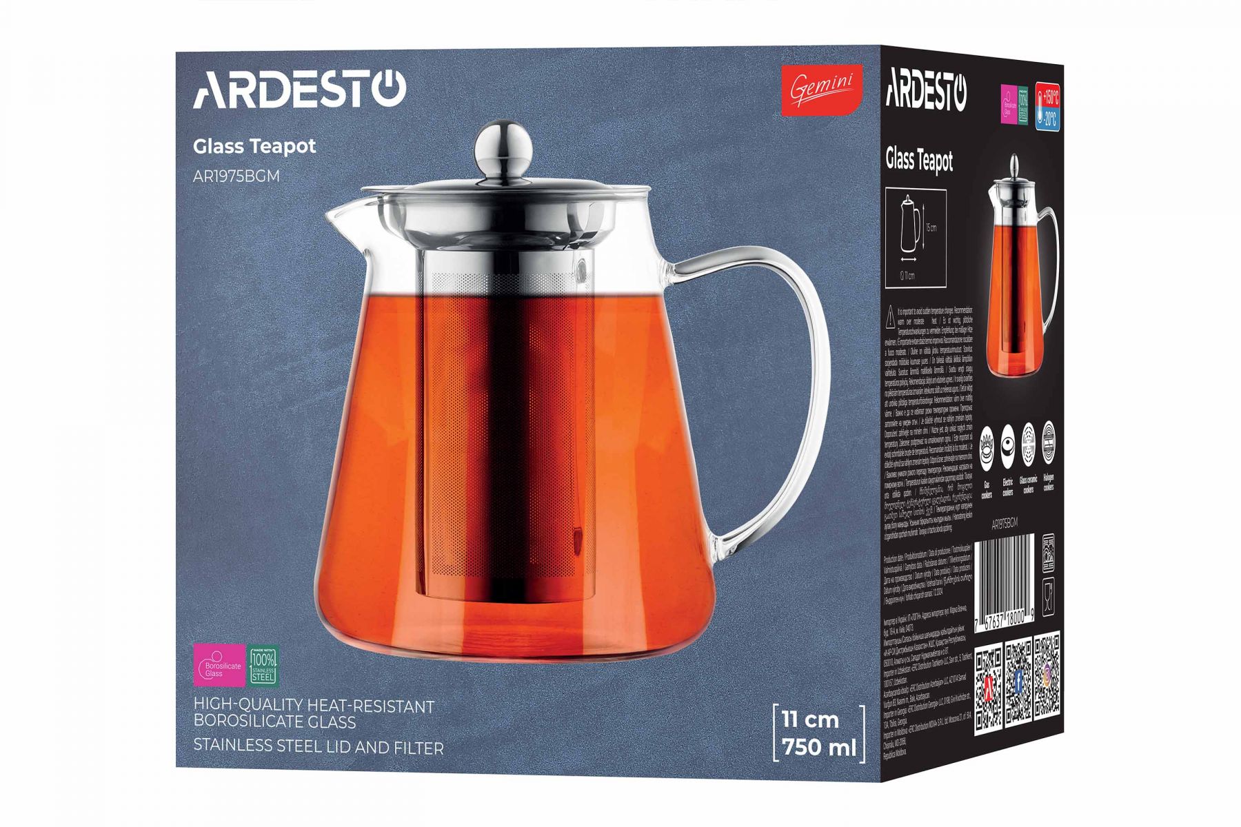 Заварник виготовлено з екологічного боросилікатного скла, яке вирізняється міцністю і стійкістю до перепадів температури, цей заварник гарантує тривале слугування і безпечне використання. Зручне ситечко з нержавіючої сталі надійно утримує всередині чайне листя листя. Об’єму 750 мл достатньо, щоби втамувати спрагу в спеку або зігрітися під час холодів. Заварник можна мити в посудомийній машині, а також підігрівати на помірному вогні. ARDESTO Gemini Milano згодиться для різних видів плит (газових, електричних, склокерамічних, галогенних).