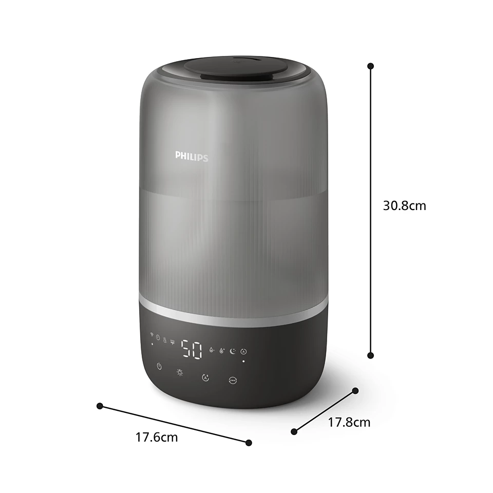 Три способи створити комфортну атмосферу за допомогою інтелектуального та компактного зволожувача повітря Philips серії 1000. Потужний туман швидко підвищує рівень вологості, водночас додаючи родзинки вашому приміщенню за допомогою аромотерапії та навколишньому освітленню. Керувати пристроєм можна за допомогою додатку Air+.