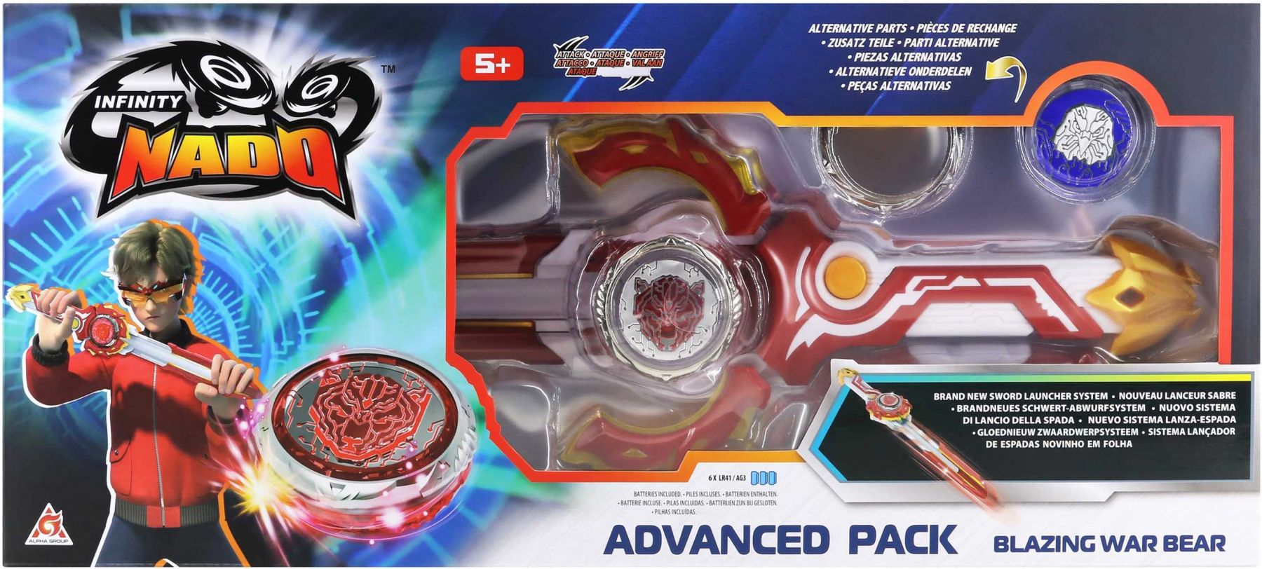 Infinity Nado VI серії Advanced Pack – дзиґа нового 6 покоління зазнала значних вдосконалень, що беззаперечно подарують нові емоції від ще більш видовищних та цікавих поєдинків. Абсолютно нова система запуску дзиґи на арену реалізована за допомогою епічного лаунчера у вигляді меча, що має більший розмір і вдосконалений зовнішній вигляд, пускова система покликана забезпечить контрольований швидкісний запуск.