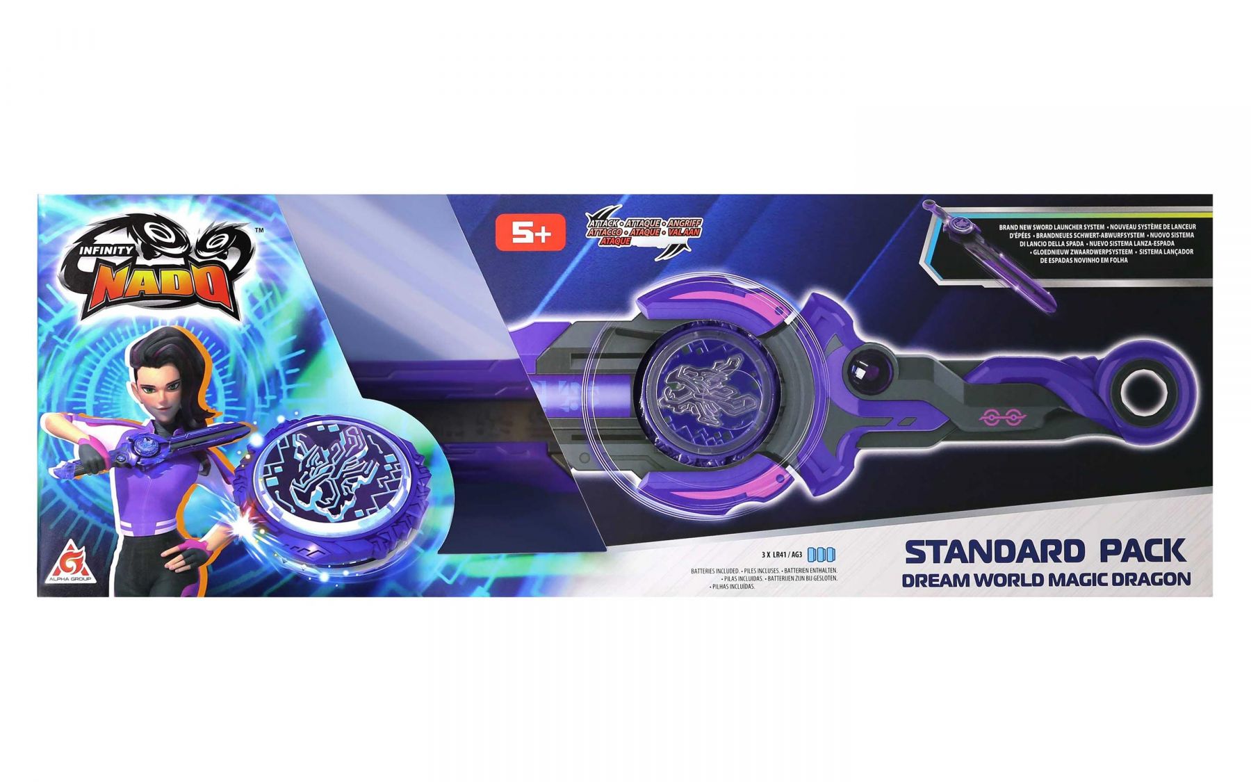 Infinity Nado VI серії Standard Pack – дзиґа нового 6 покоління зазнала значних вдосконалень, що беззаперечно подарують нові емоції від ще більш видовищних та цікавих поєдинків. Абсолютно нова система запуску дзиґи на арену реалізована за допомогою епічного лаунчера у вигляді меча, пускова система покликана забезпечити контрольований швидкісний запуск.