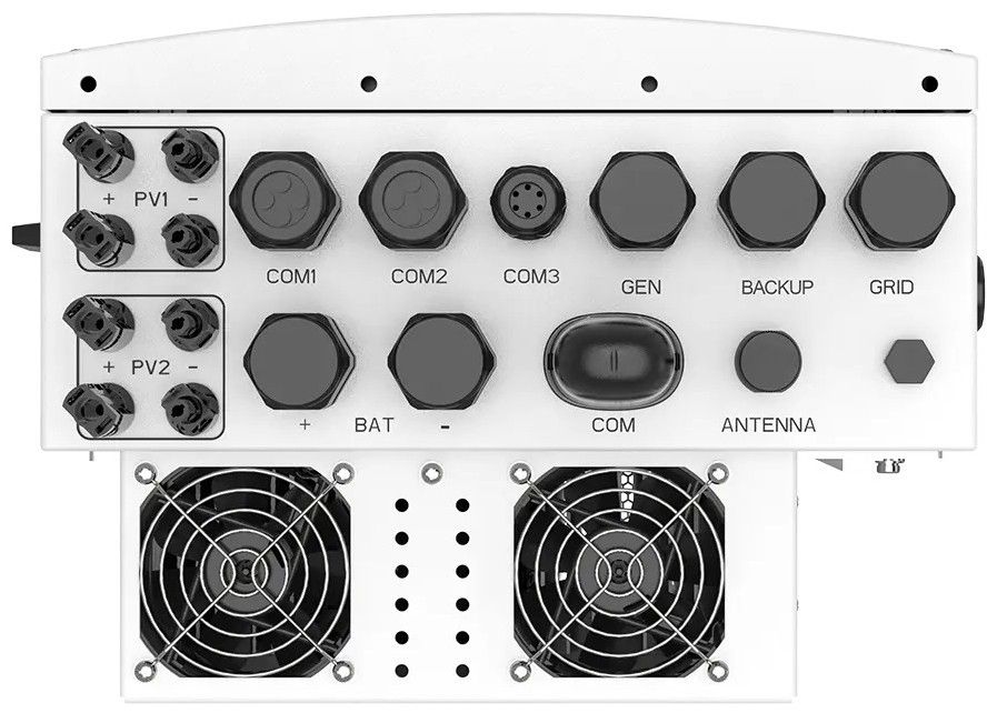 Захист:IP66, вбудований модуль AFCI 2.0, моніторинг замикання на землю, від зворотної полярності постійного струму, I / II (PV і BAT), III (MAINS і BACKUP і GEN)