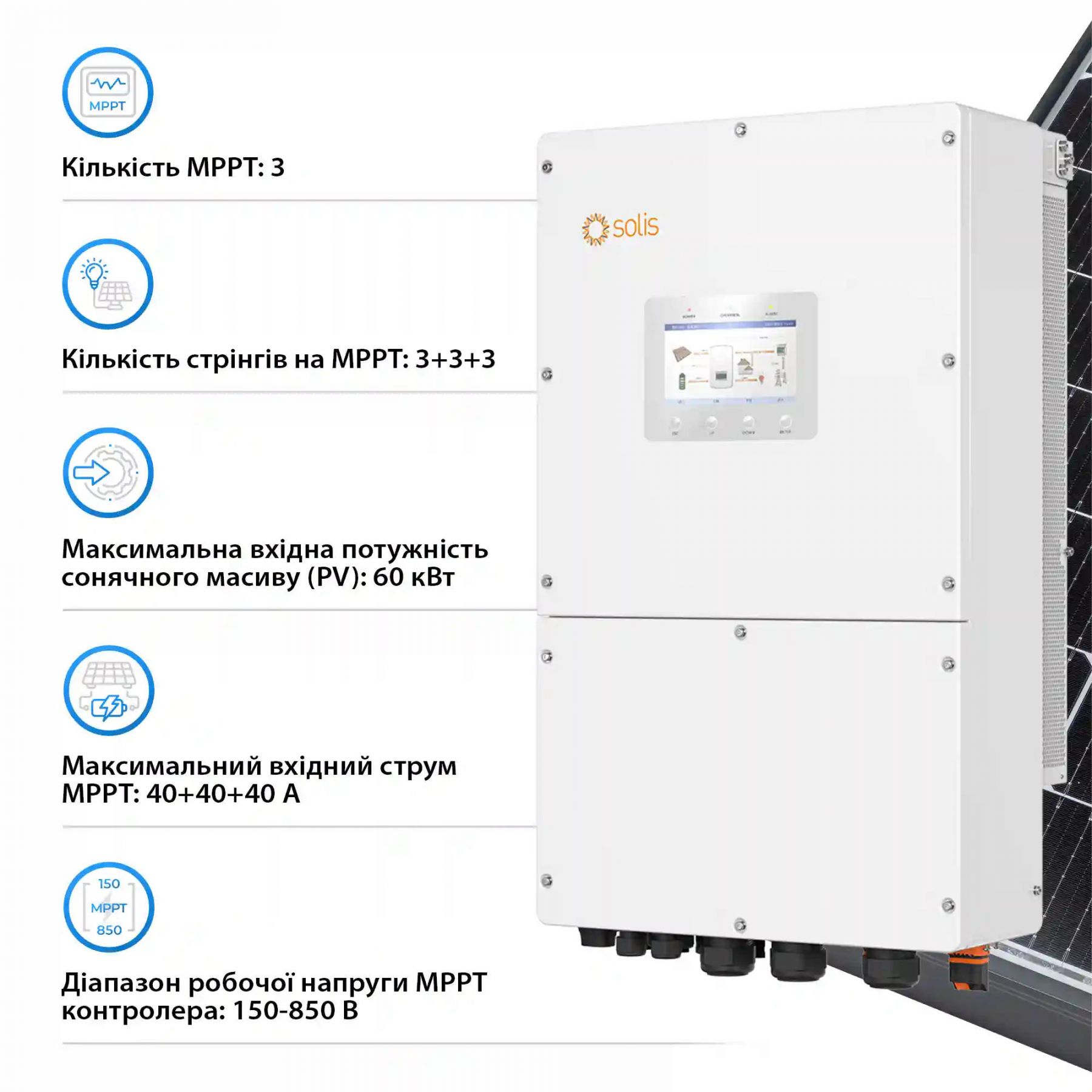 Гібридний трифазний інвертор Solis S6-EH3P30K-H потужністю 30 кВт призначений для комерційних систем зберігання енергії з фотоелектричними станціями. Три незалежні MPPT з вхідним струмом 40 А на кожен трекер дозволяють максимально використовувати енергію сонячних модулів. Інвертор підтримує високовольтні літій-іонні батареї, незалежний порт генератора та паралельну роботу кількох пристроїв. Швидке резервне перемикання менше 10 мс та адаптація до несиметричних навантажень забезпечують надійне енергопостачання.