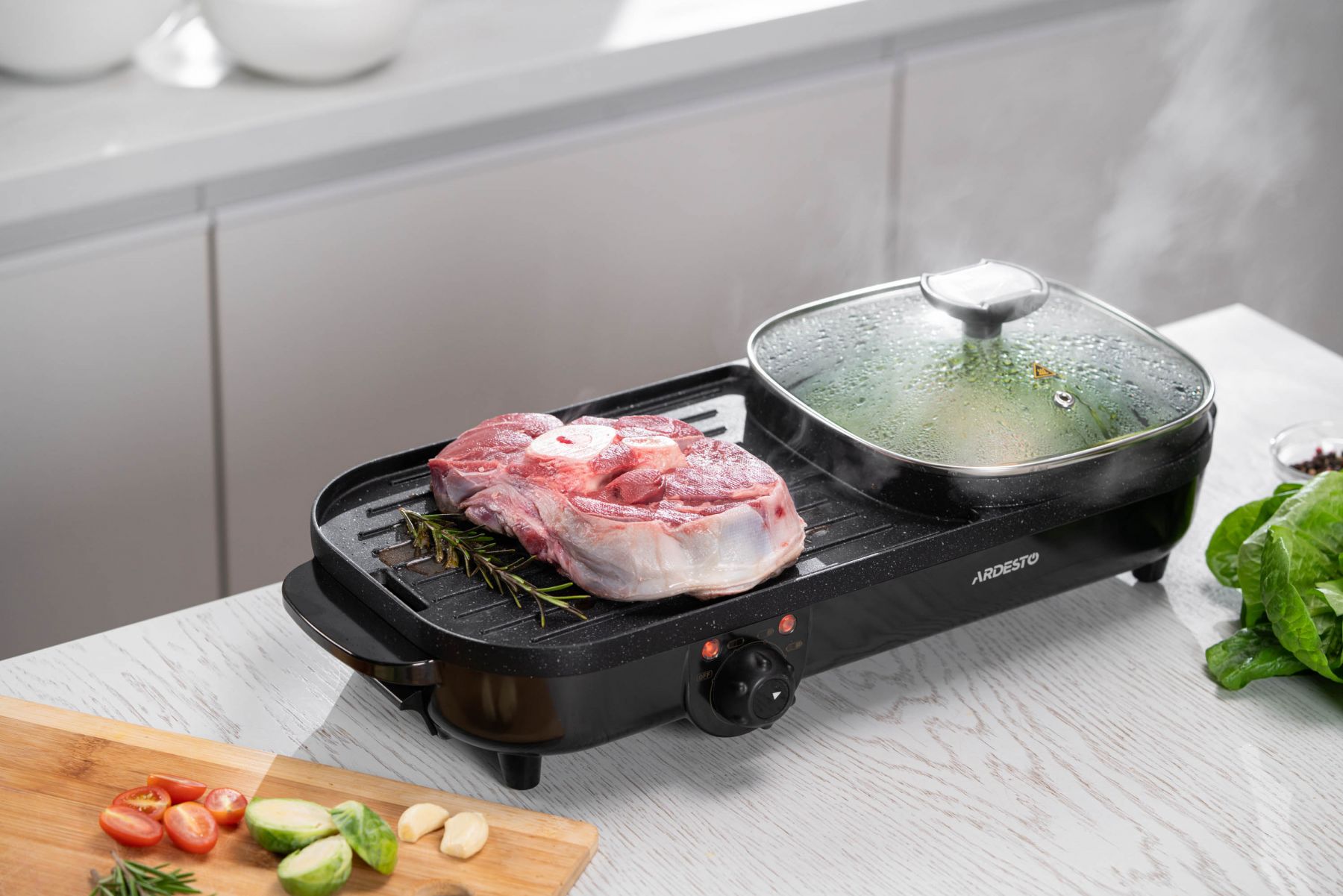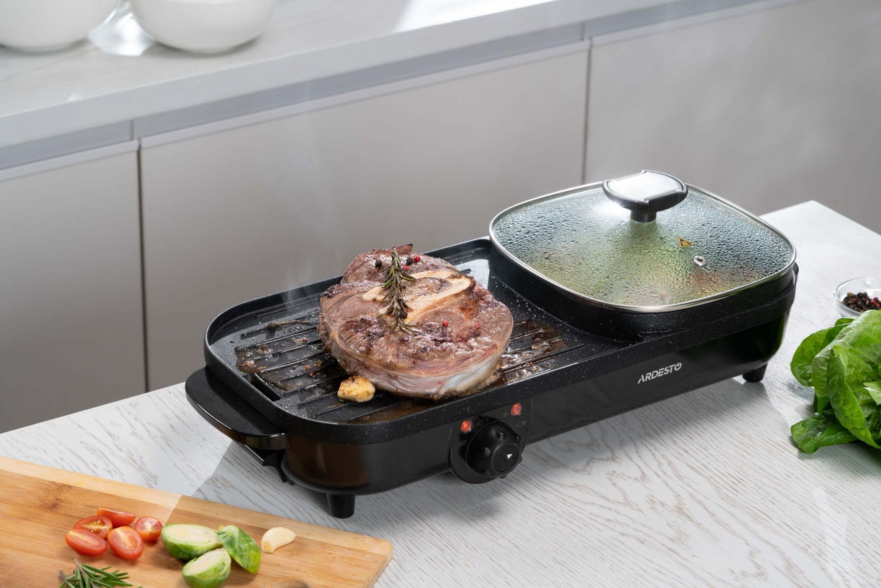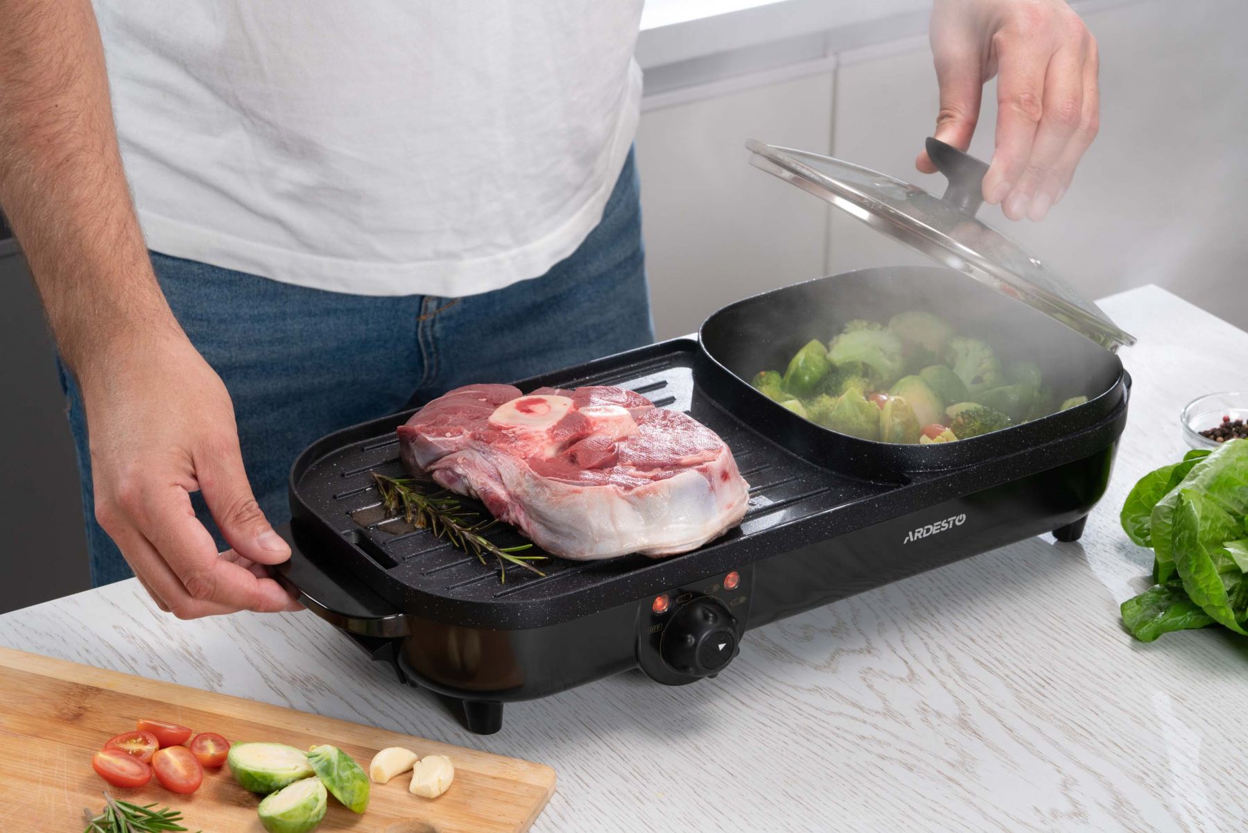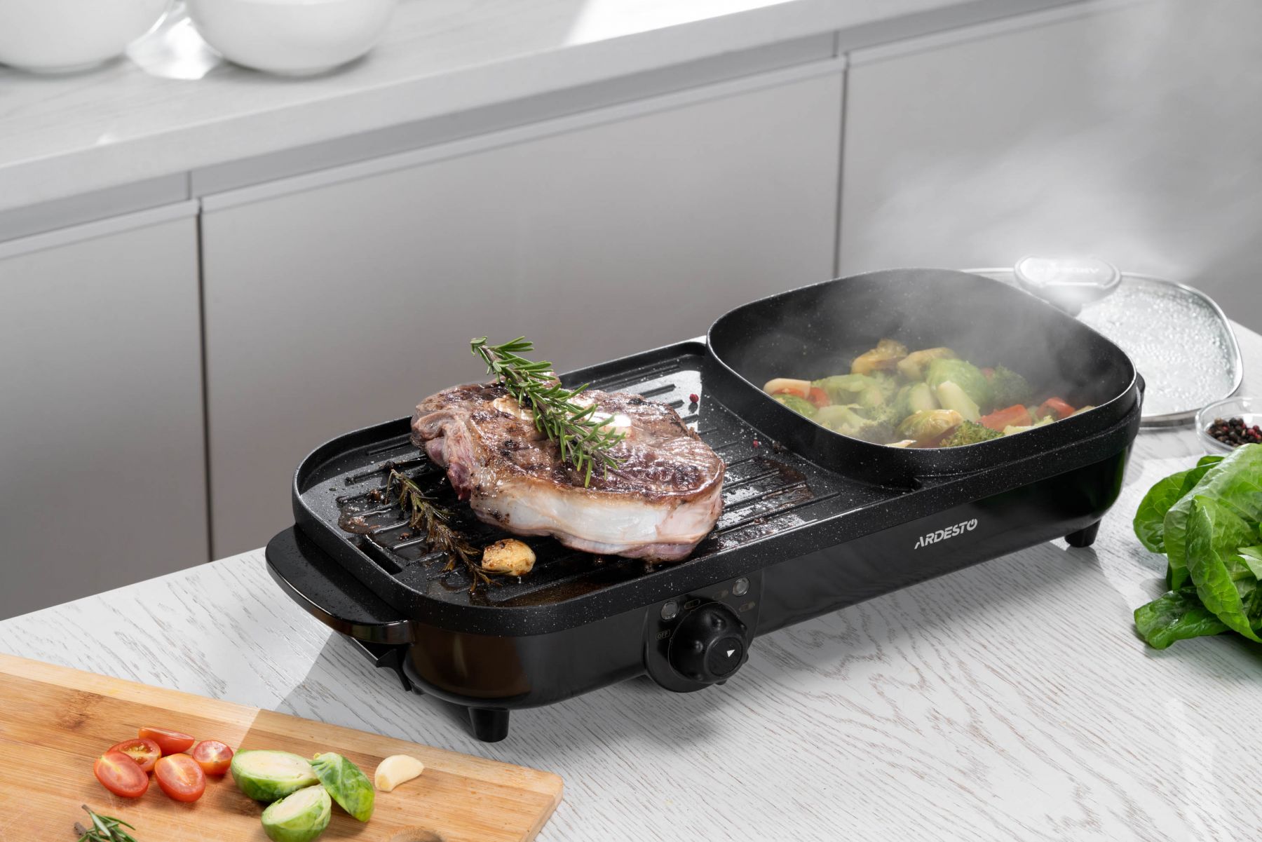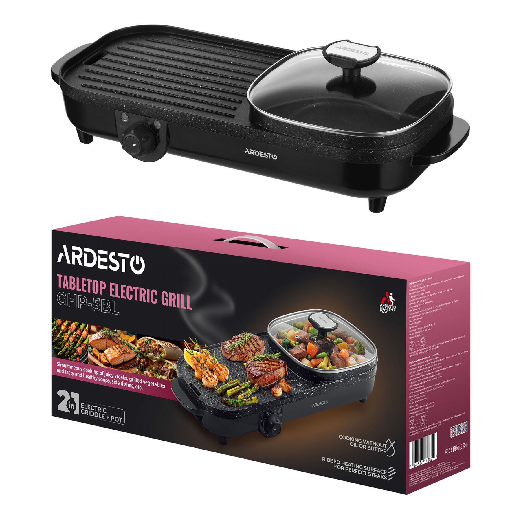 Функції:Регулювання температури, нековзаючі ніжки, ручка для переміщення, антипригарне покриття, ребриста пластина, Можливість приготування без додавання олії чи масла, Легке очищення нагрівальної поверхні, з можливістю миття під струменем води, Система захисту від перегріву, Знімний піддон для жиру, кабель, Одночасне приготування соковитих стейків, овочів на грилі та смачних і корисних супів, гарнірів тощо