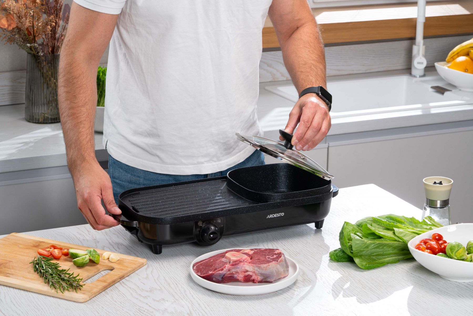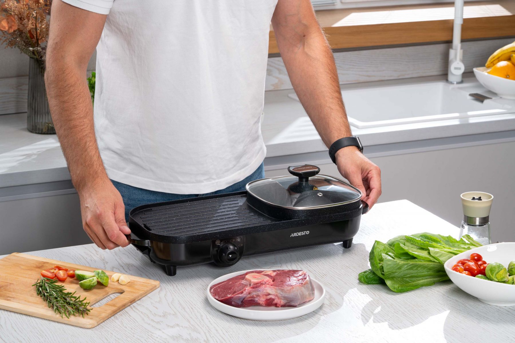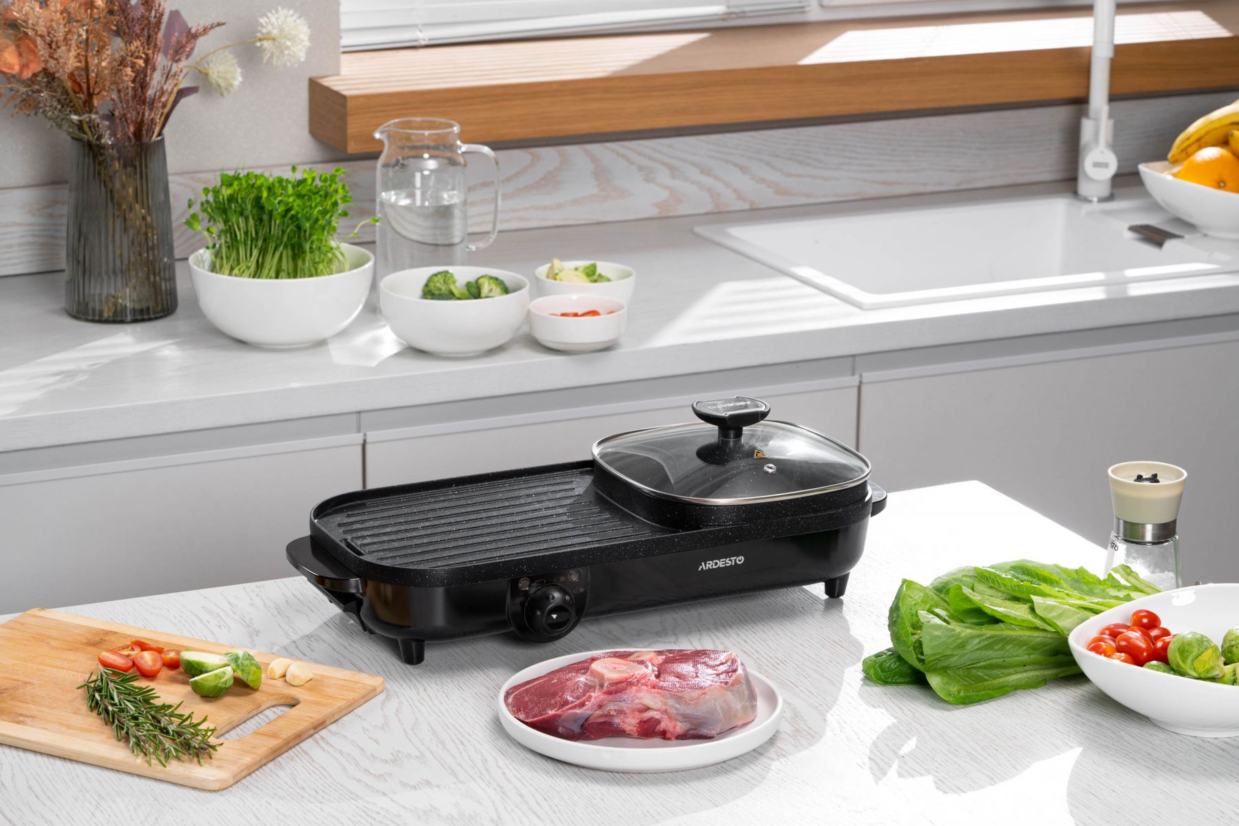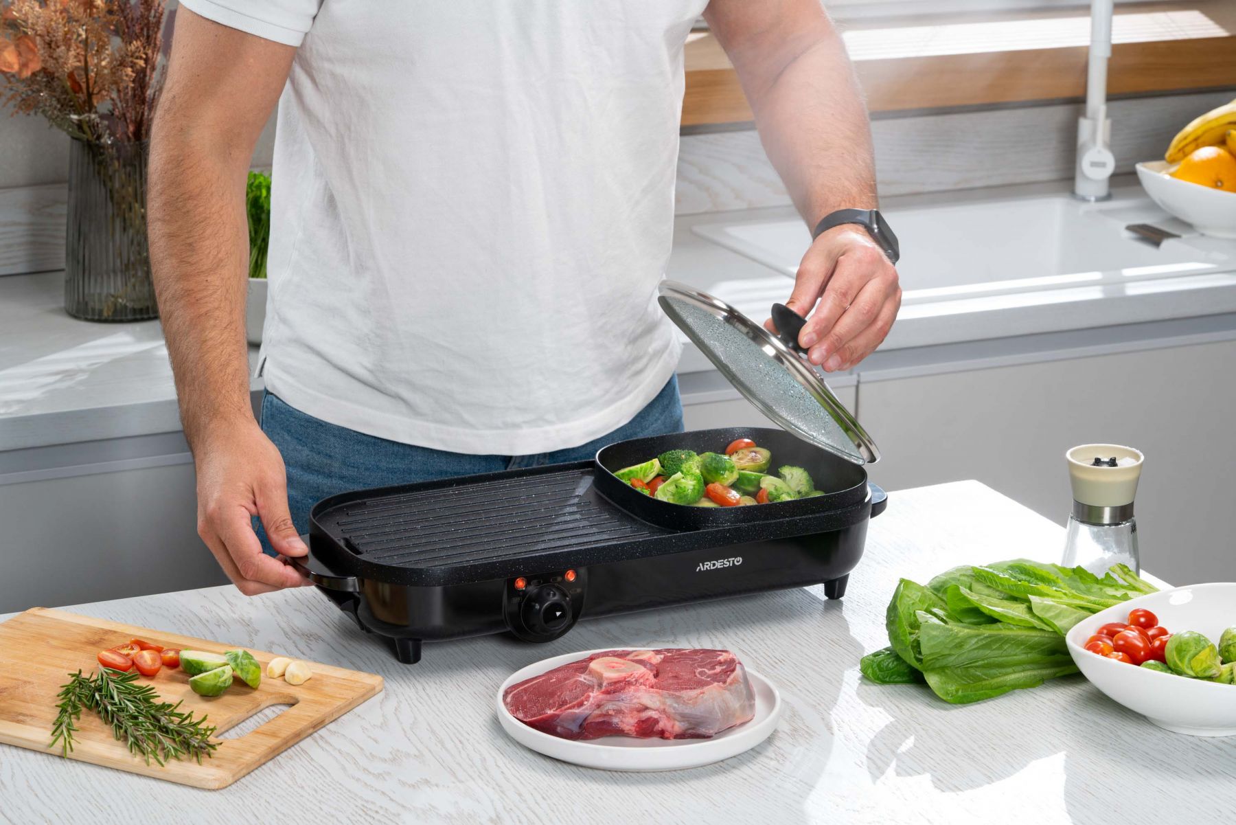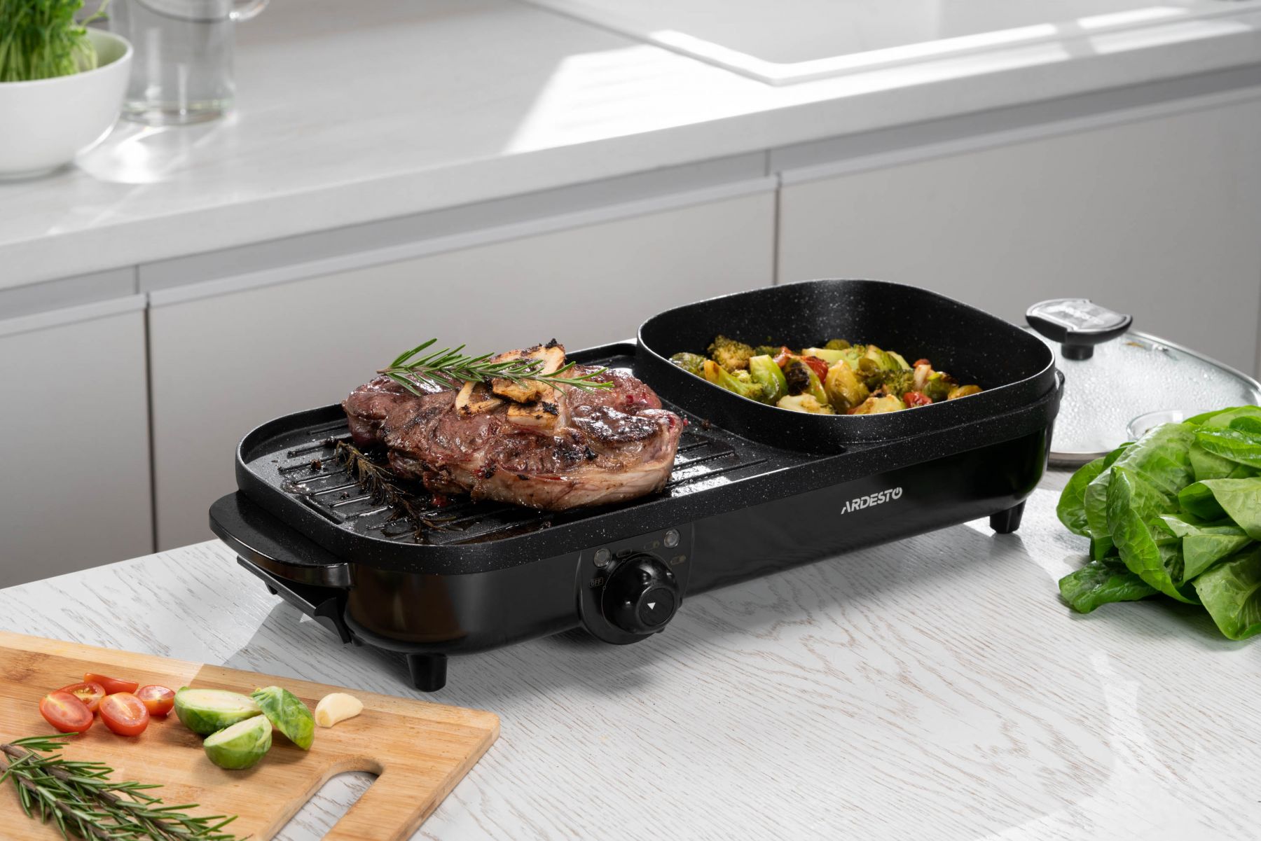 Функції:Регулювання температури, нековзаючі ніжки, ручка для переміщення, антипригарне покриття, ребриста пластина, Можливість приготування без додавання олії чи масла, Легке очищення нагрівальної поверхні, з можливістю миття під струменем води, Система захисту від перегріву, Знімний піддон для жиру, кабель, Одночасне приготування соковитих стейків, овочів на грилі та смачних і корисних супів, гарнірів тощо