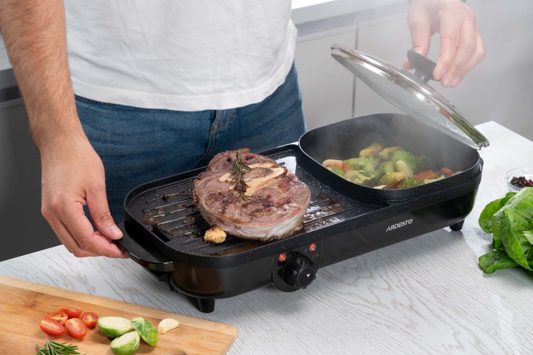 Настільний електричний гриль ARDESTO GHP-5BL – це поєднання функціональності та зручності. Завдяки трьом режимам можна готувати соковиті стейки, овочі на грилі та смачні гарніри чи супи. Ба більше, можна навіть поєднати кілька кулінарних процесів, адже конструкцією передбачено ребристу поверхню для смаження 24,5 × 20 см і відокремлену ємність для варіння об’ємом 1,8 л. Протипригарне покриття зумовлює можливість смажити без олії, а автоматичне налаштування температури залежно від вибраного режиму готування забезпечує щоразу вдалий результат.