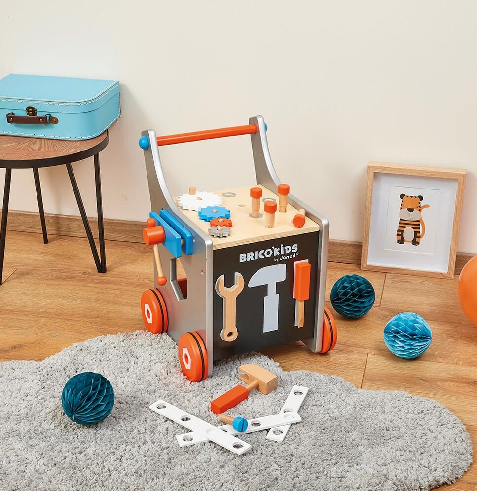 Іграшкова пересувна майстерня для хлопчиків від французького бренда Janod. Ігровий набір повністю вироблений із дерева. Його особливість в тому, що він має вигляд візочка на колесах, а відтак його легко транспортувати з одного місця у інше. Столик із магнітною дошкою для інструментів та поверхнею для майстрування. Розмір столика 37 x 35 x 44 см. Робочі інструменти (молоток, гайковий ключ, викрутка) зручно зберігати на вертикальній магнітній поверхні. Серед інших деталей – дерев’яні гвинти, гайки, пластини, шестерінки. Збоку столика також є іграшковий затискач. Для дітей від 3-х років.