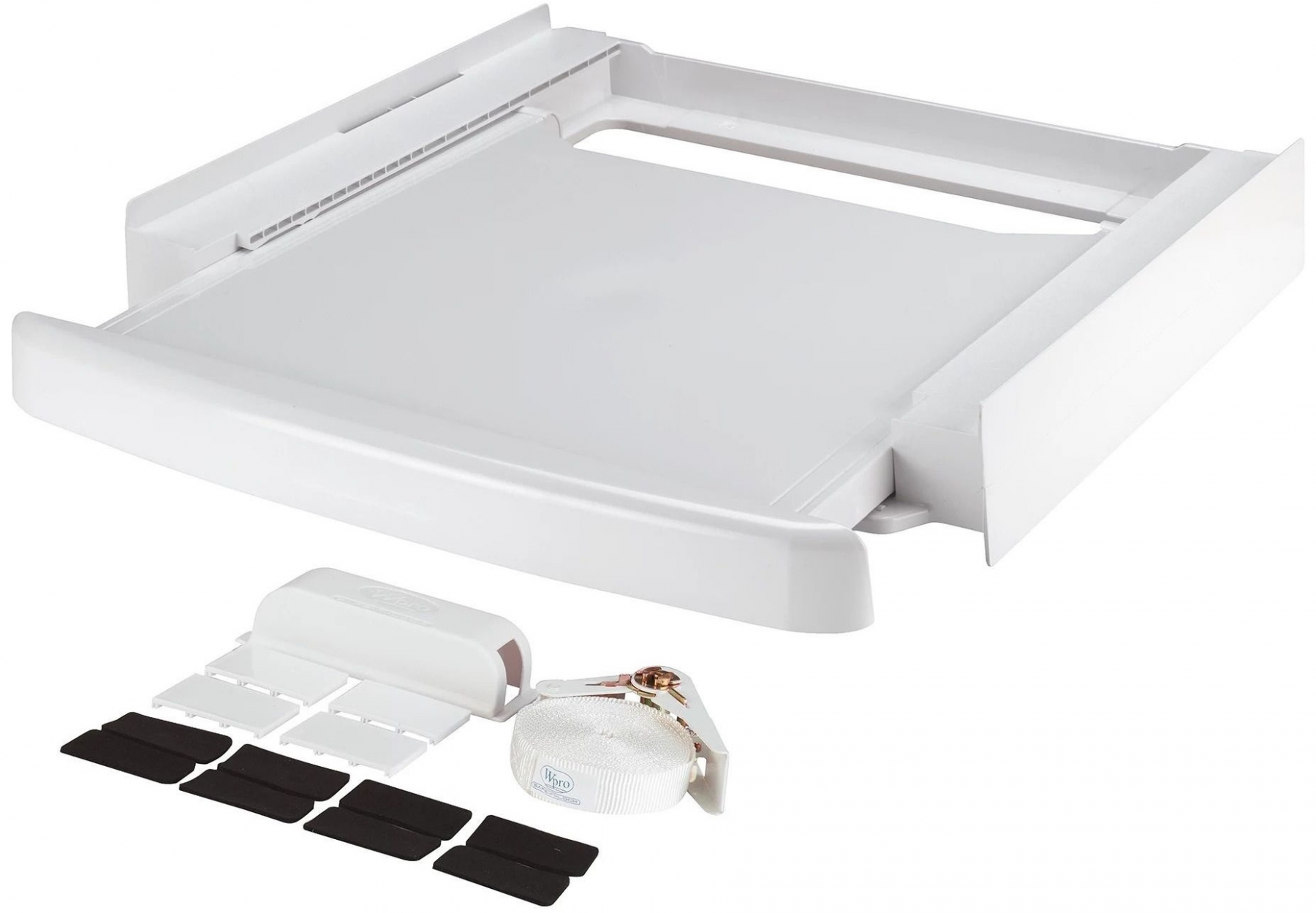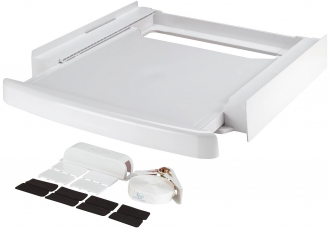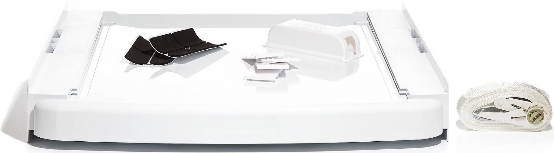 Комплектація і сумісність:для пральних машин, для сушильних машин глибиною 45 - 60 см, Комплект для кріплення з висувною полицею, 8 гумових протиковзких накладок, 4 пластикові жорсткі пластини, 1 кришка "Safe-in-Lock®", 1 ремінь "Safe-in-Lock®" з натяжним пристроєм, інструкція зі встановлення