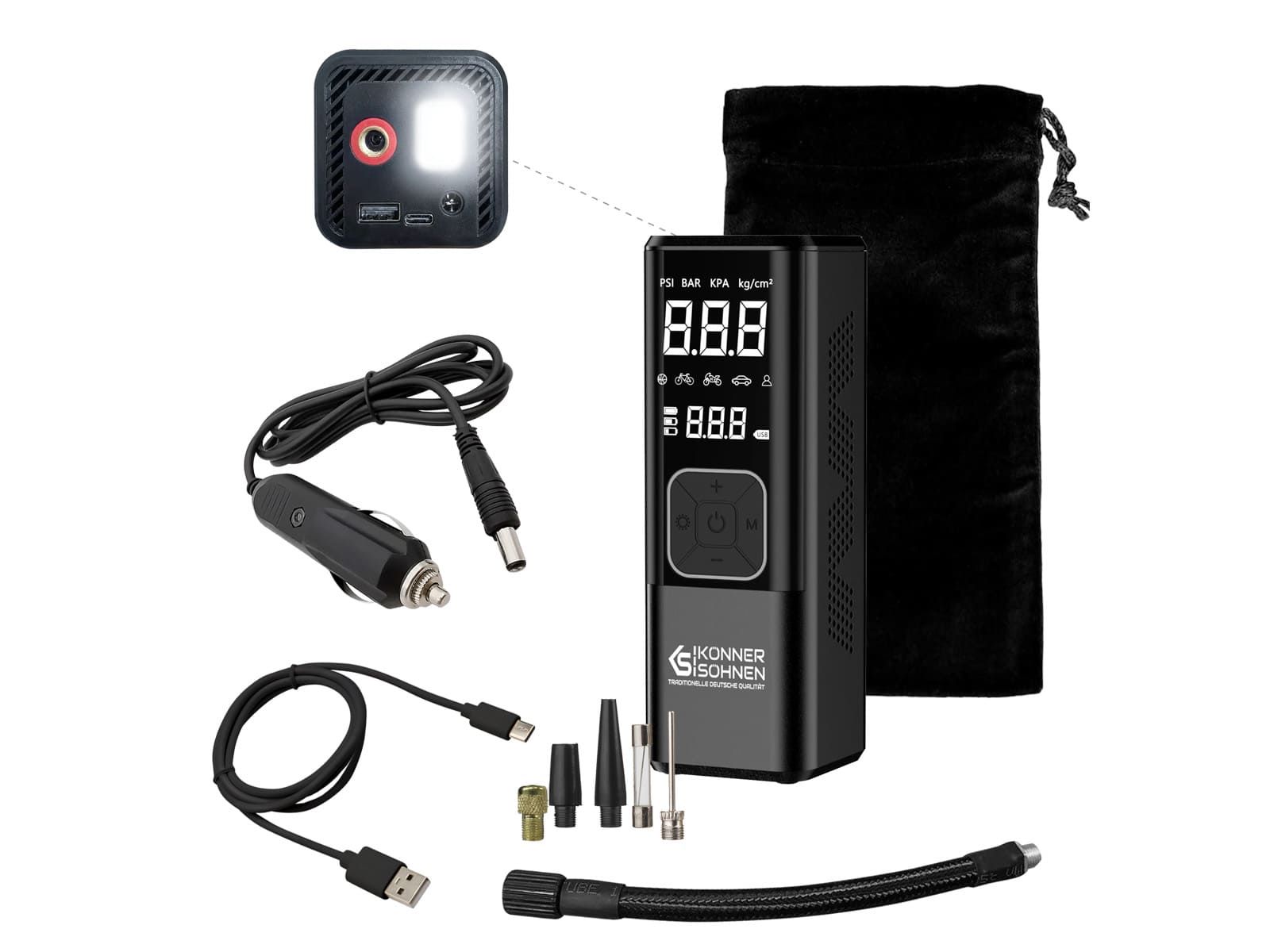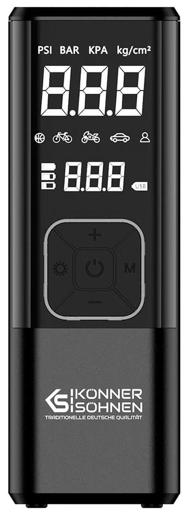 Автомобільний компресор KS P20 з функцією повербанкку від Könner & Söhnen – це надійний помічник для накачки будь-яких типів коліс (авто-мото техніки, велосипедів, колясок, садових та будівельних тачок та ін), а також стане в нагоді й власникам спортінвентарю, підходить для м'ячів, надувних матраців, плавальних іграшок, жилетів та інших надувних виробів. Накачування відбувається за рахунок акумуляторної батареї, тобто немає необхідності підключати компресор до джерела живлення (електромережі або акумулятора авто), процес накачування займає лічені хвилини. Швидкість накачування компресором KS P20 становить 23 літри на хвилину.