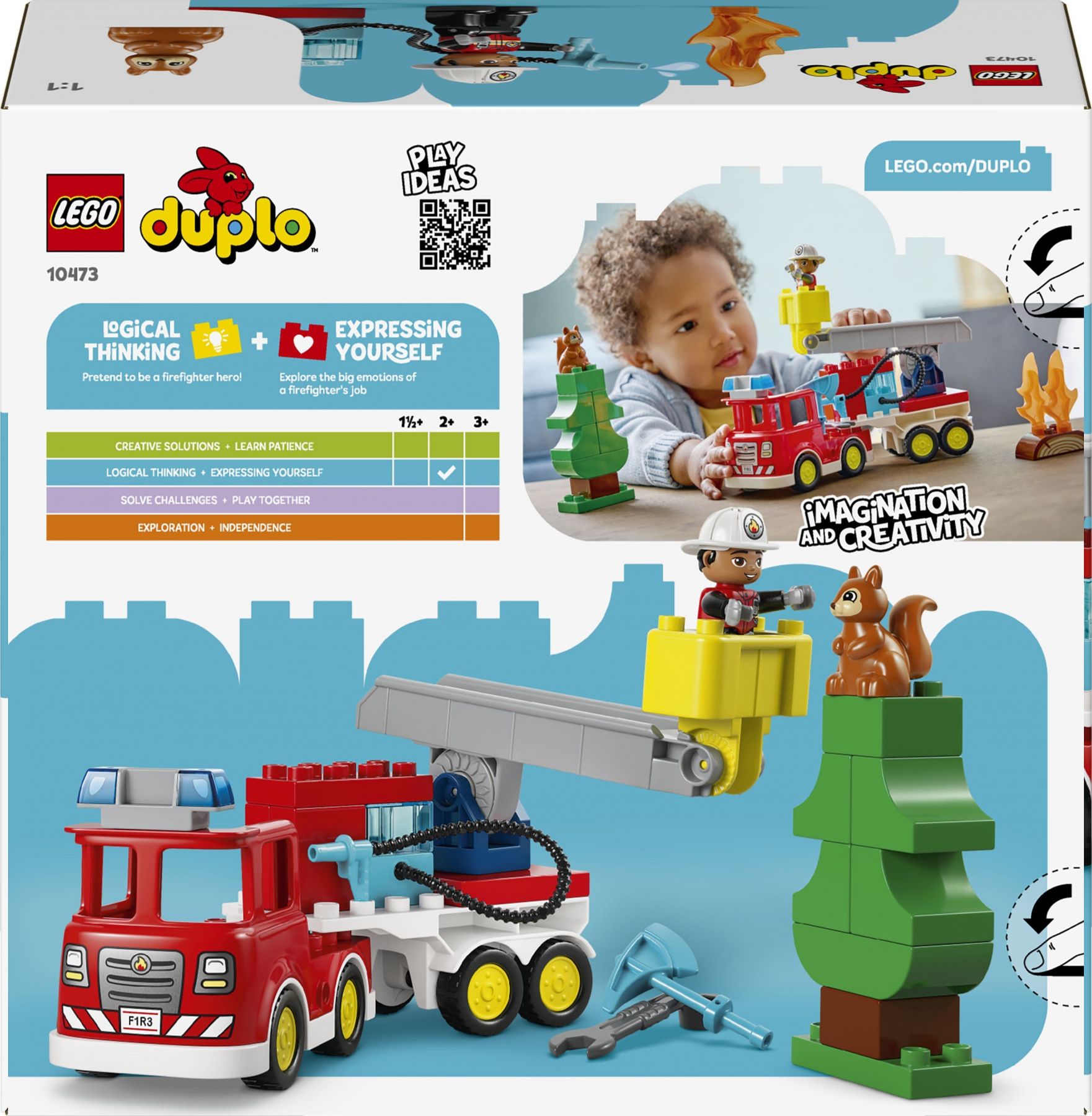 Набір LEGO® DUPLO® Town «Пожежна машина зі шлангом і пожежником» (10473) — це транспортний засіб екстрених служб, що сподобається малюкам від 2 років і дасть їм змогу уявити себе рятувальниками. Ця іграшкова пожежна машина має безліч функцій, як-от гнучкий шланг, дерево й фігурка білки LEGO DUPLO. Ця розвивальна іграшка може допомогти малюкам опанувати необхідні навички дошкільного віку. Вони можуть формувати емоційний інтелект, розвиваючи емпатію, уявляючи себе хоробрим пожежником, який наполегливо працює, щоб допомогти іншим.