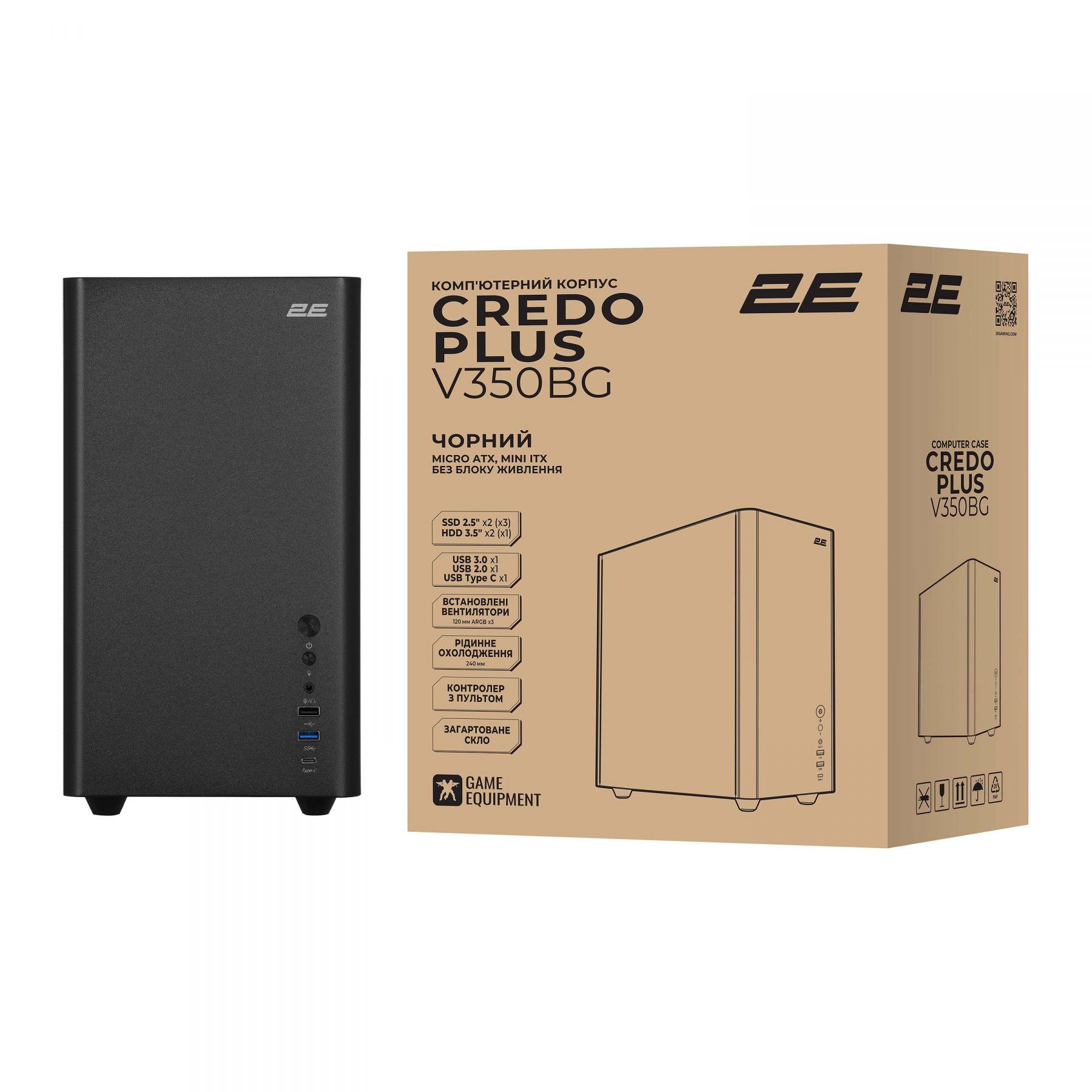 Корпус 2E Credo Plus V350BG без БЖ, 1xUSB3.0, 1х USB 2.0, 1xUSB Type-C, 3x120мм ARGB, VGA 350мм, LCS ready, контролер з пультом, TG Side Panel, mATX, чорний