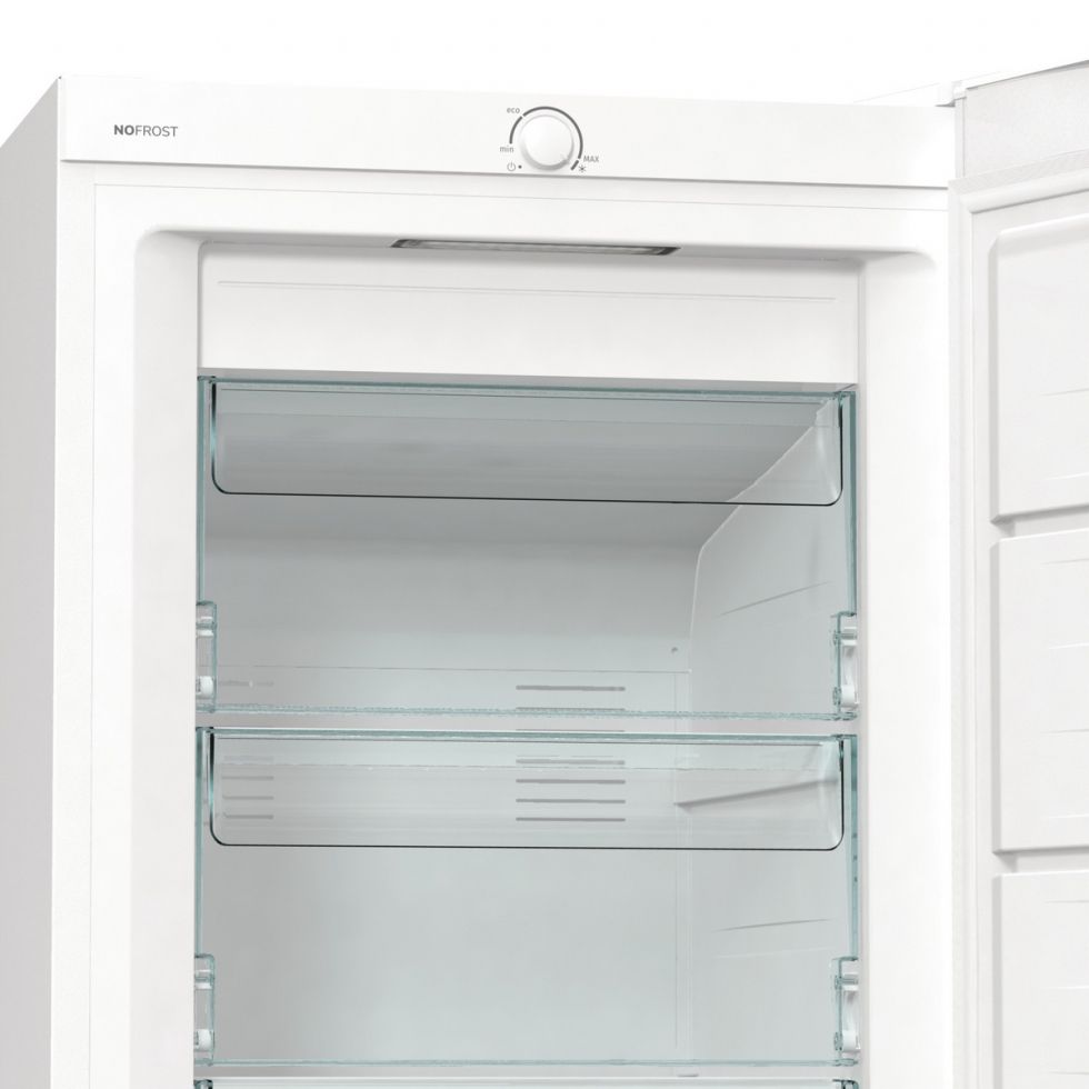 Забудьте про стомлююче розморожування. Інтенсивна циркуляція холодного повітря виводить вологу з морозильної шафи. Це запобігає утворенню льоду на продуктах та внутрішніх стінках приладу, а також знижує витрату електроенергії. В результаті збільшується корисний простір для зберігання і відпадає необхідність у розморожуванні та очищенні приладу. Упаковки продуктів не примерзають одна до одної і зберігаються у належному вигляді.