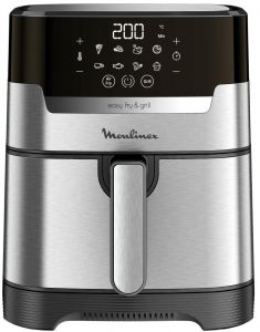 Мультипіч Moulinex EasyFry&Grill Digital з потужністю 1550 Вт та чашею 4,2 л забезпечує приготування на 6 порцій. Технологія Extra Crisp з циркуляцією потоків гарячого повітря та робочою температурою 80-200 °C. Сенсорне керування з 8 автоматичними програмами: картопля фрі, курка, нагетси, риба, м'ясо, піца, овочі, десерт, плюс 2 ручних режими аерофритюр та гриль.