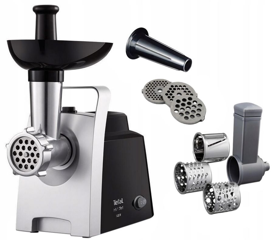 М'ясорубка Tefal HV1 7in1, 1400Вт, 1.7кг/хв, 3 решітки, насадка для ковбас, 3 терки, пластик, чорно-сріб.