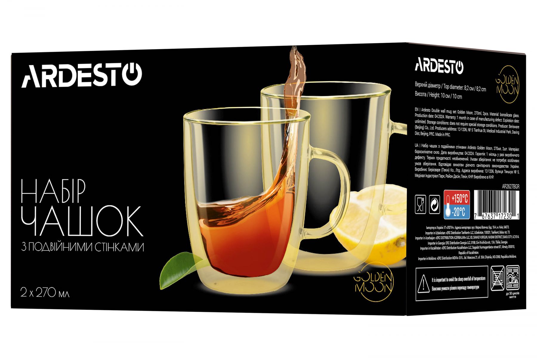 Набір чашок з ручками і подвійними стінками Ardesto Golden Moon, 270мл, 2шт, боросилікатне скло, золотистий