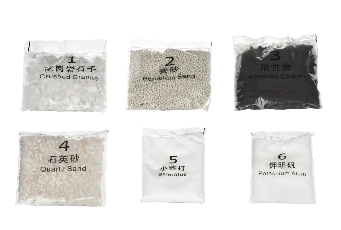 В комплекті:частини для збірки фільтра, гранітна крихта, фарфоровий пісок, активоване вугілля, кварцевий пісок, паперовий фільтр, спонжевий фільтр, бікарбонат натрію, сульфат алюмінію-калію