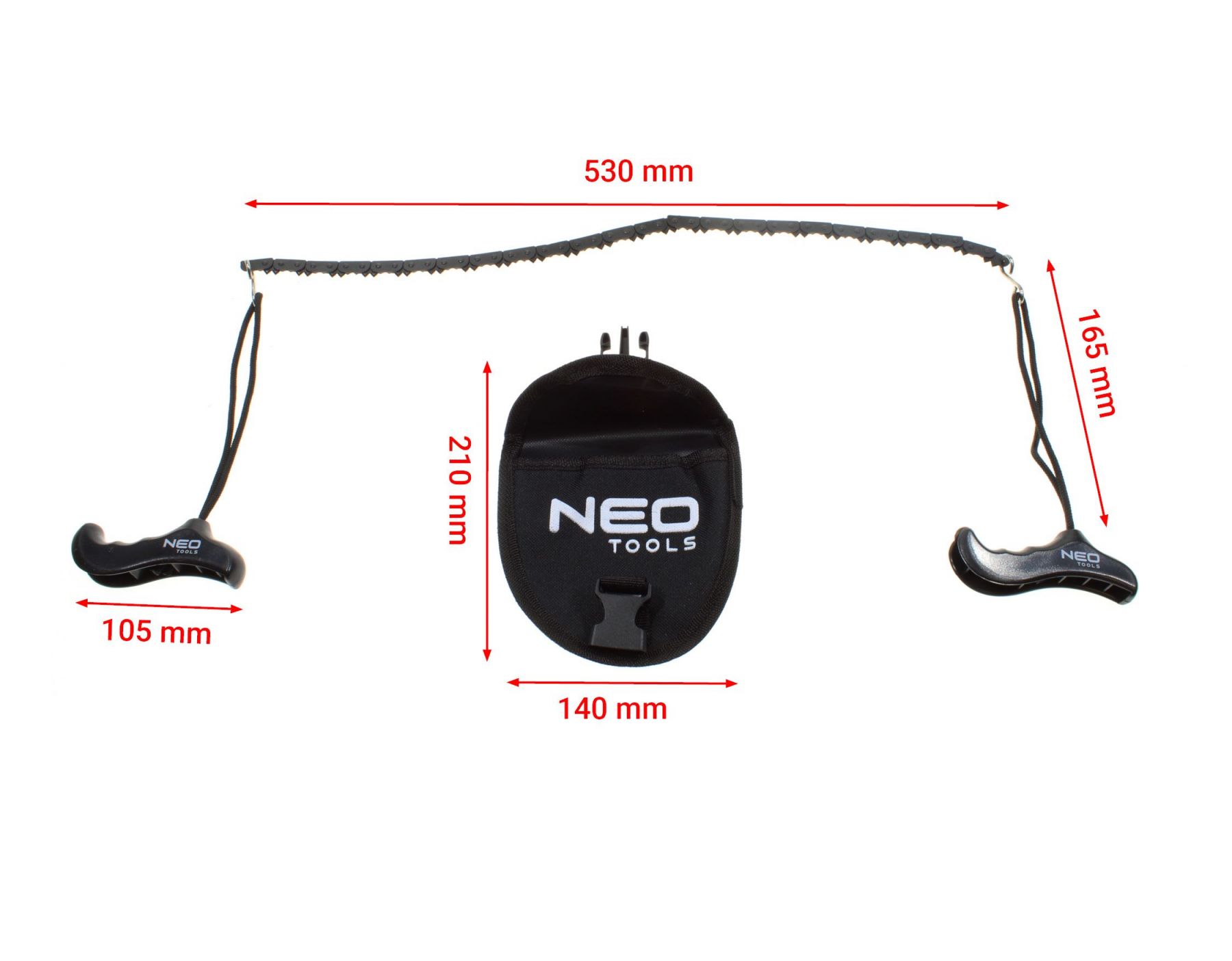 Пилка ручна ланцюгова NEO, 53 см 63-158 - це інструмент із лезом із марганцевої сталі з твердістю 52-54 HRC. Вона має рукоятку з ABS, а її повна вага складає 150 г. Довжина всієї пили становить 98 см, а довжина полотна – 53 см. Інструмент оснащений самоочисними та двонаправленими зубами. Складана конструкція у вигляді кишені дозволяє легко зберігати його в нейлоновому чохлі, що входить до комплекту. Бренд NEO рекомендується любителям виживання.