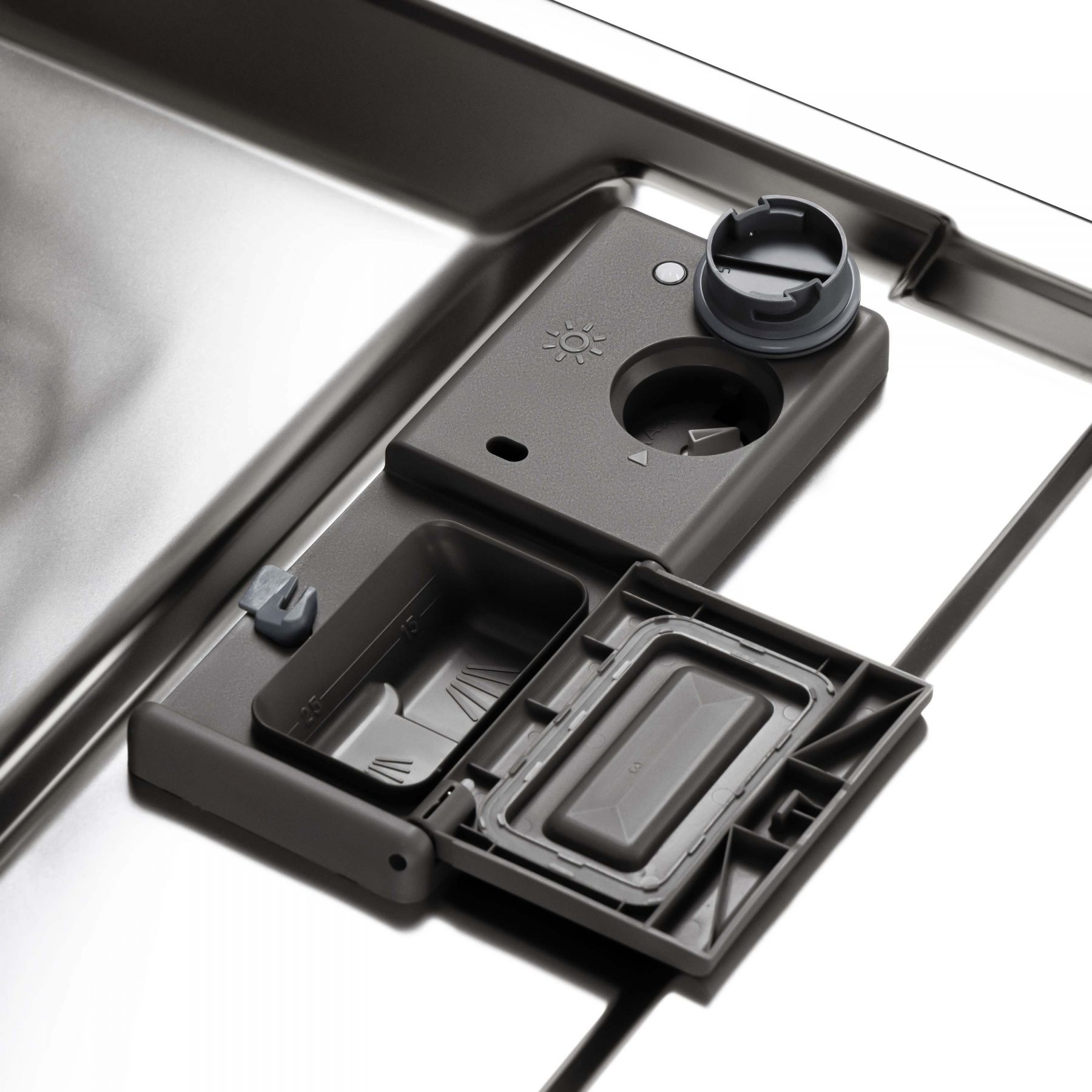 Особливі:Регульована по висоті верхня корзина, знімний фільтр, дозатор з відкидною кришкою, пом’якшувач води, полиці для чашок